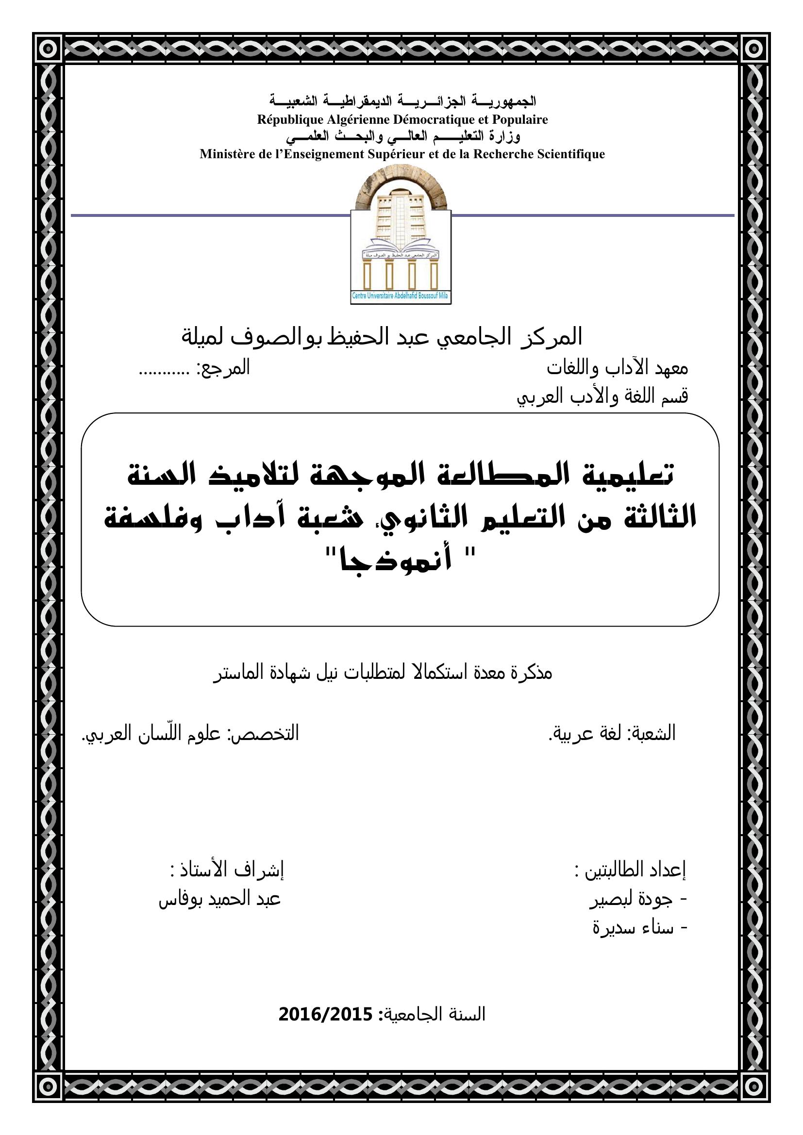 لبصير جودة & بوفاس عبد الحميد(مشرفا) (2016). تعليمية المطالعة الموجهة لتلاميذ السنة الثالثة من التعليم الثانوي شعبة آداب وفلسفة "أنموذجا ".