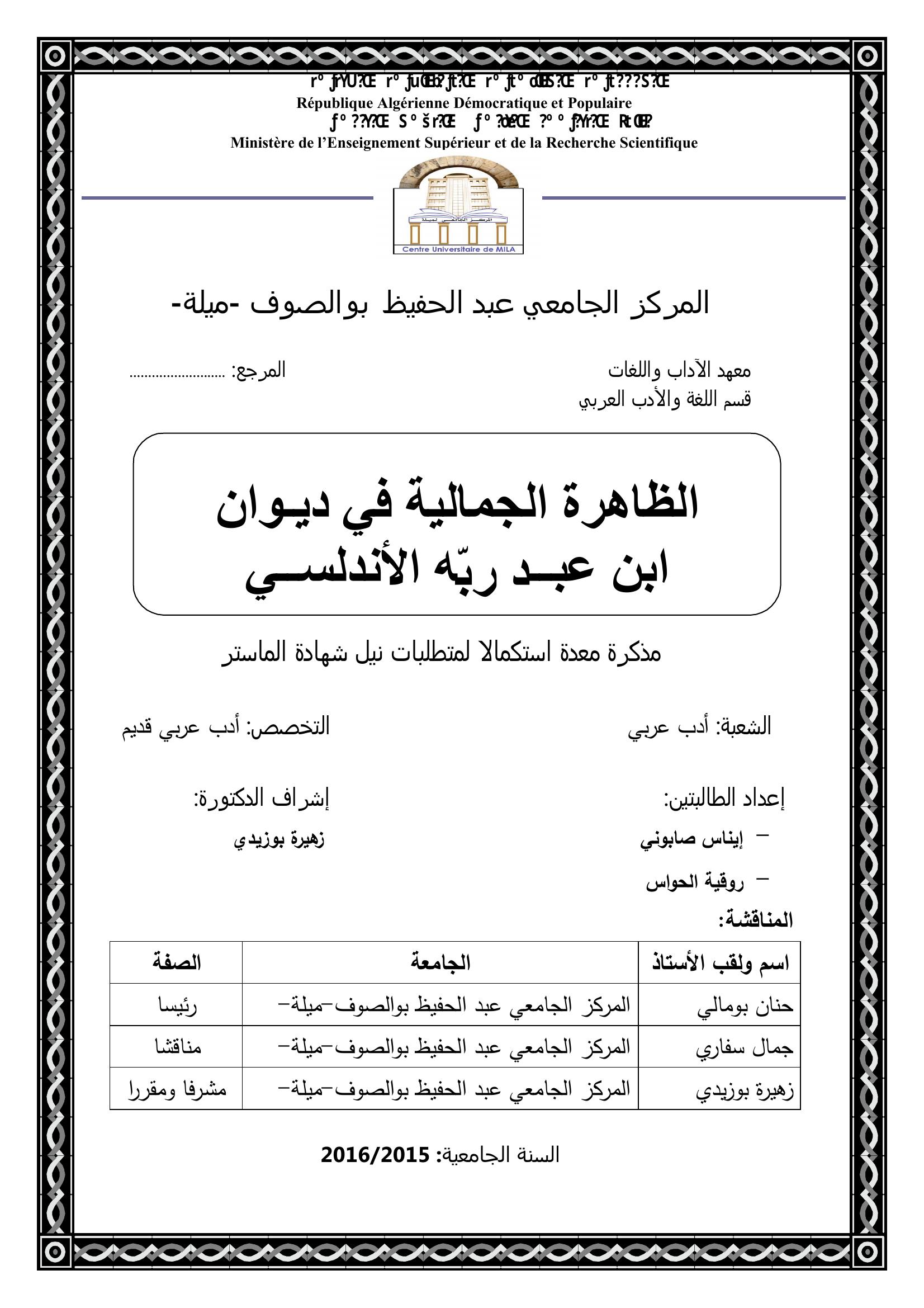 صابوني إيناس & بوزيدي زهيرة (مشرفا) (2016). الظاهرة الجمالية في ديوان ابن عبد ربه الأندلسي.