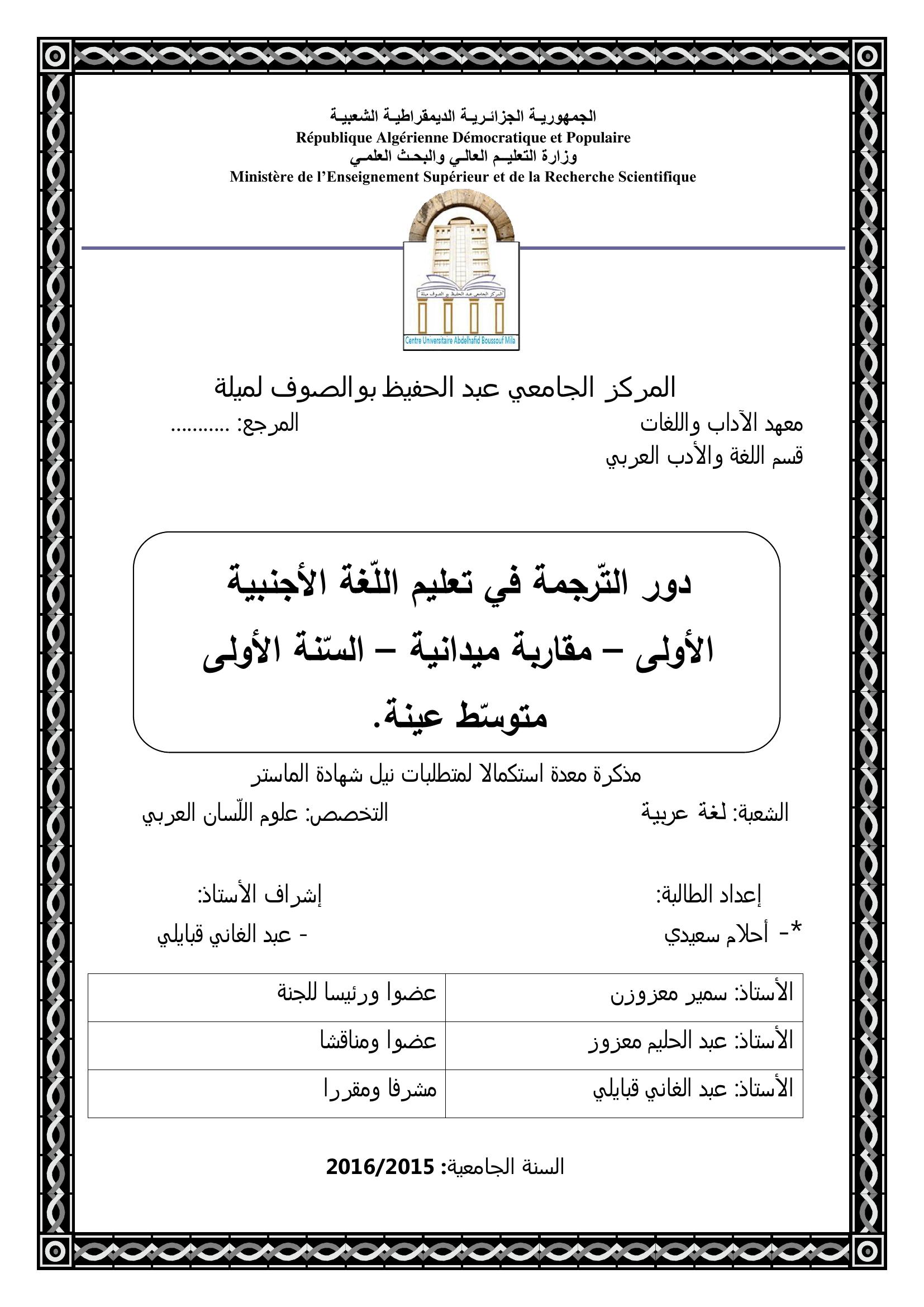 سعيدي أحلام & قبايلي عبد الغاني (مشرفا) (2016). دور الترجمة في تعليم اللغة الأجنبية الأولى مقاربة ميدانية السنة الأولى متوسط عينة.
