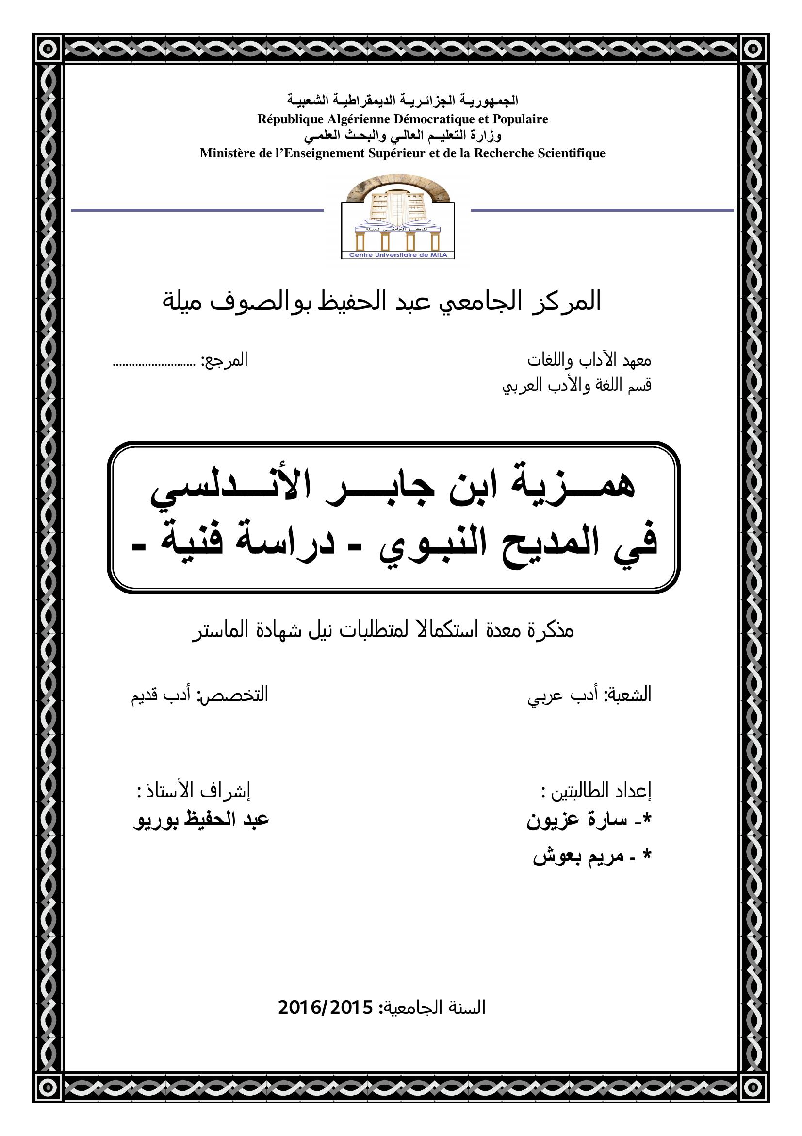 عزيون سارة & بورايو عبد الحفيظ (مشرفا) (2016). همزية ابن جابر الأندلسي في المديح النبوي دراسة فنية.