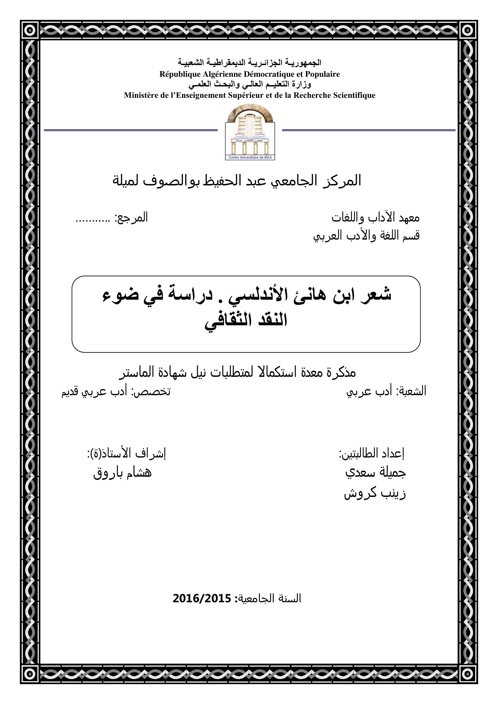 سعدي جميلة & باروق هشام( مشرفا) (2016). شعر ابن هانئ الأندلسي دراسة في ضوء النقد الثقافي.