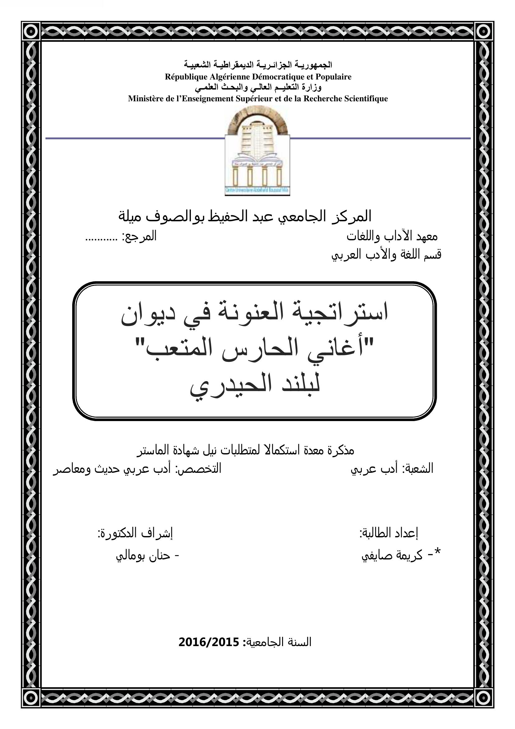 صايفي كريمة & بومالي حنان (2016). إستراتيجية العنونة في ديوان" أغاني الحارس المتعب" لبلند الحيدري.