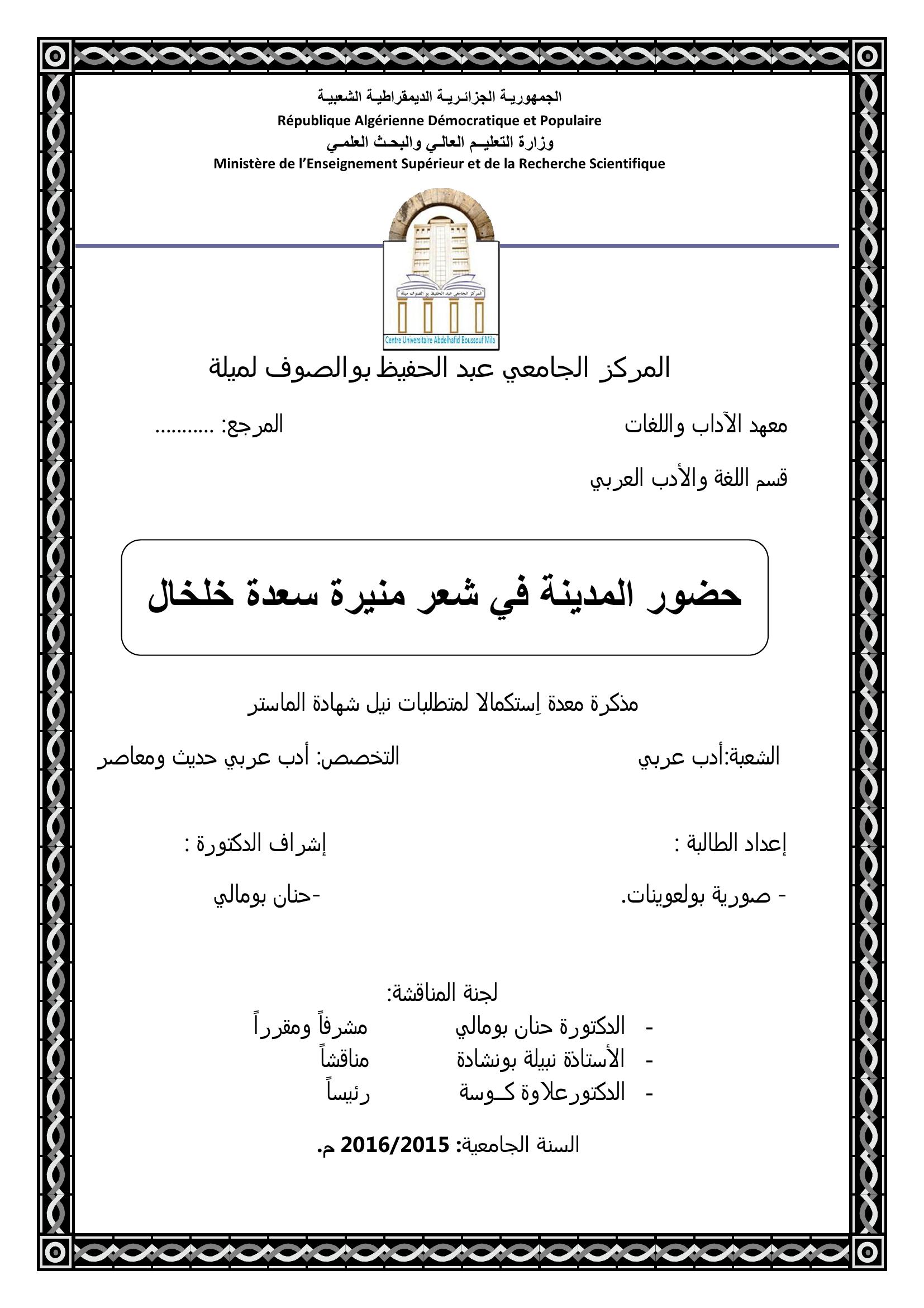 بولعوينات صورية & بومالي حنان (2016). حضور المدينة في شعر منيرة سعدة خلخال.
