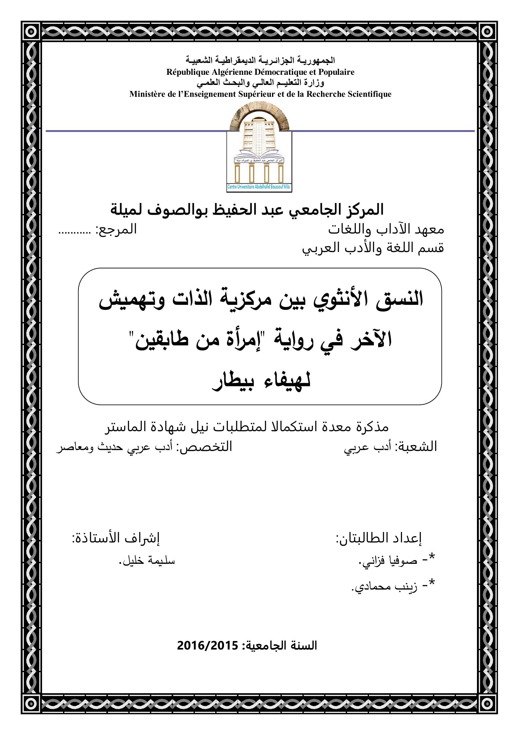فزاني صوفيا & خليل سليمة (مشرفا) (2016). النسق الأنثوي بين مركزية الذات وتهميش الآخر في رواية "إمرأة من طابقين " لهيفاء بيطار.