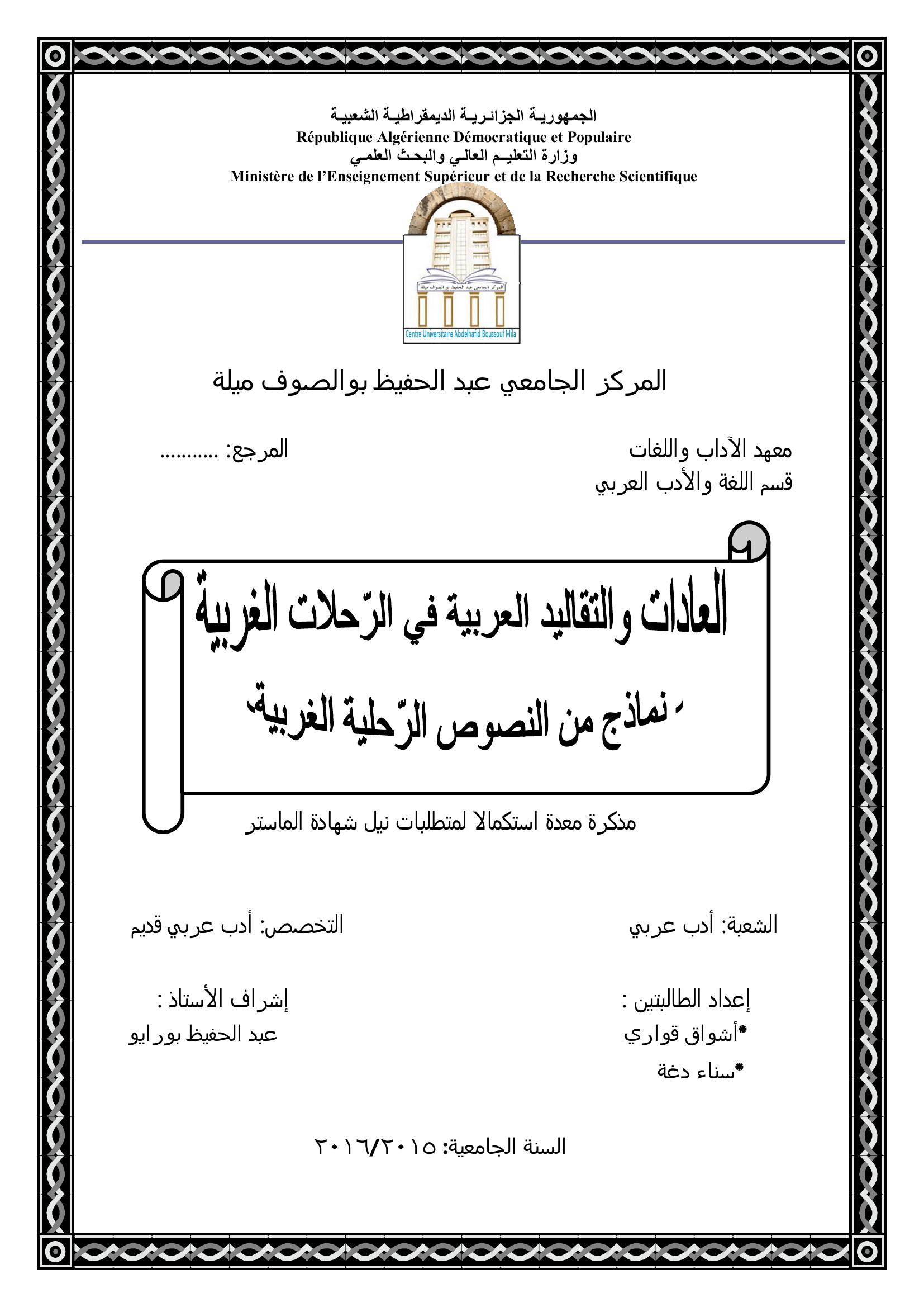 قواري أشواق & بورايو عبد الحفيظ (مشرفا) (2016). العادات والتقاليد العربية في الرحلات الغربية نماذج من النصوص الرحلية الغربية.