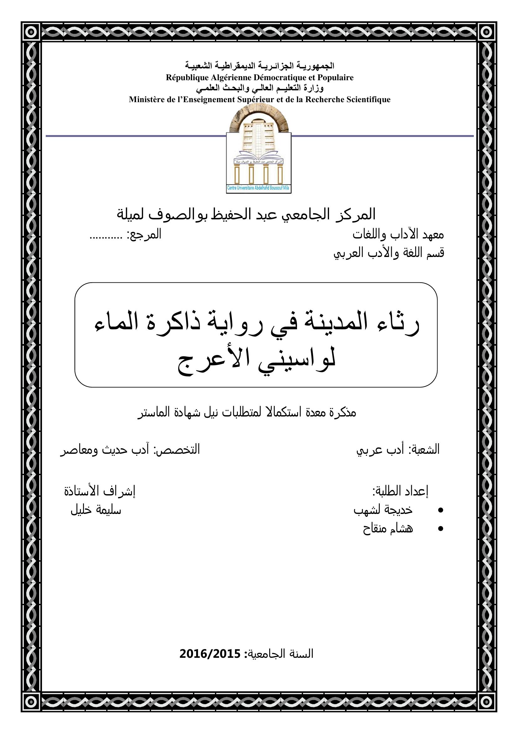 لشهب خديجة & خليل سليمة (مشرفا) (2016). رثاء المدينة في رواية ذاكرة الماء لواسيني الأعرج.