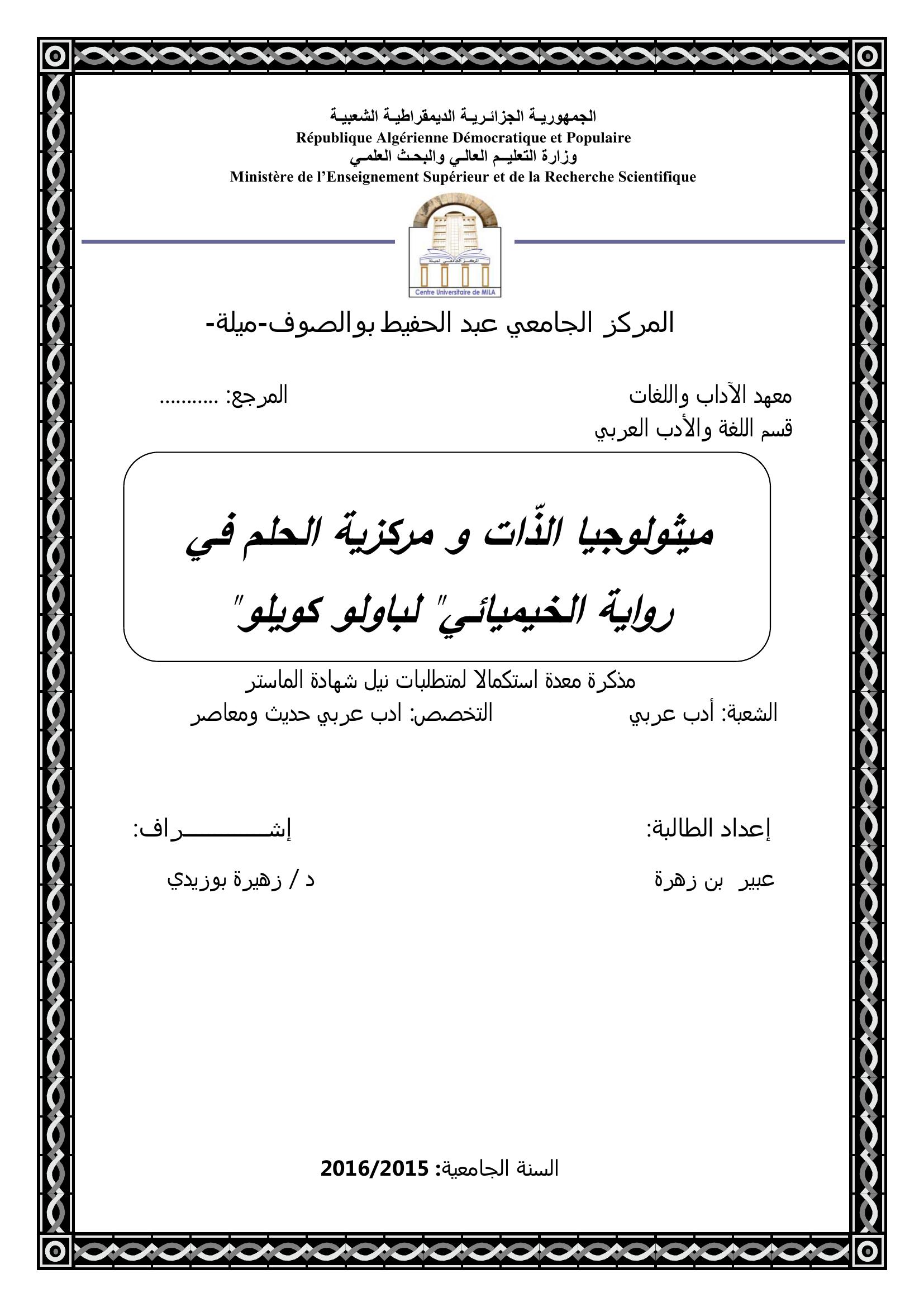 بن زهرة عبير & بوزيدي زهيرة (مشرفا) (2016). ميثولوجيا الذات ومركزية الحلم في رواية الخيميائي " لباولو كويلو ".
