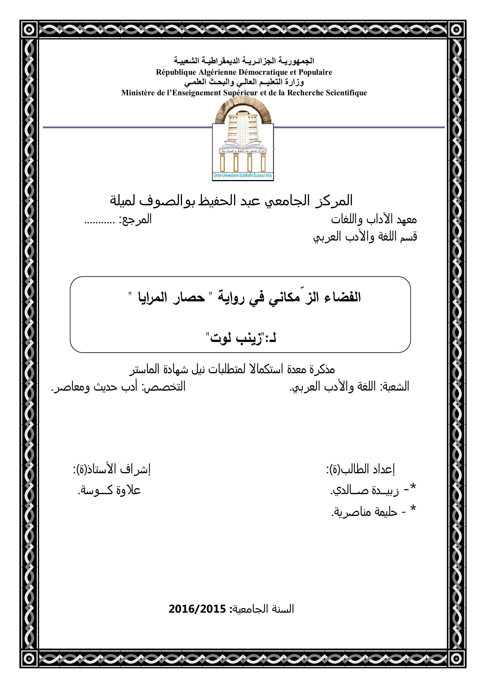صالدي زبيدة & كوسة علاوة (مشرفا) (2016). الفضاء الز مكاني في رواية حصار المرايا لـ زينب لوت.