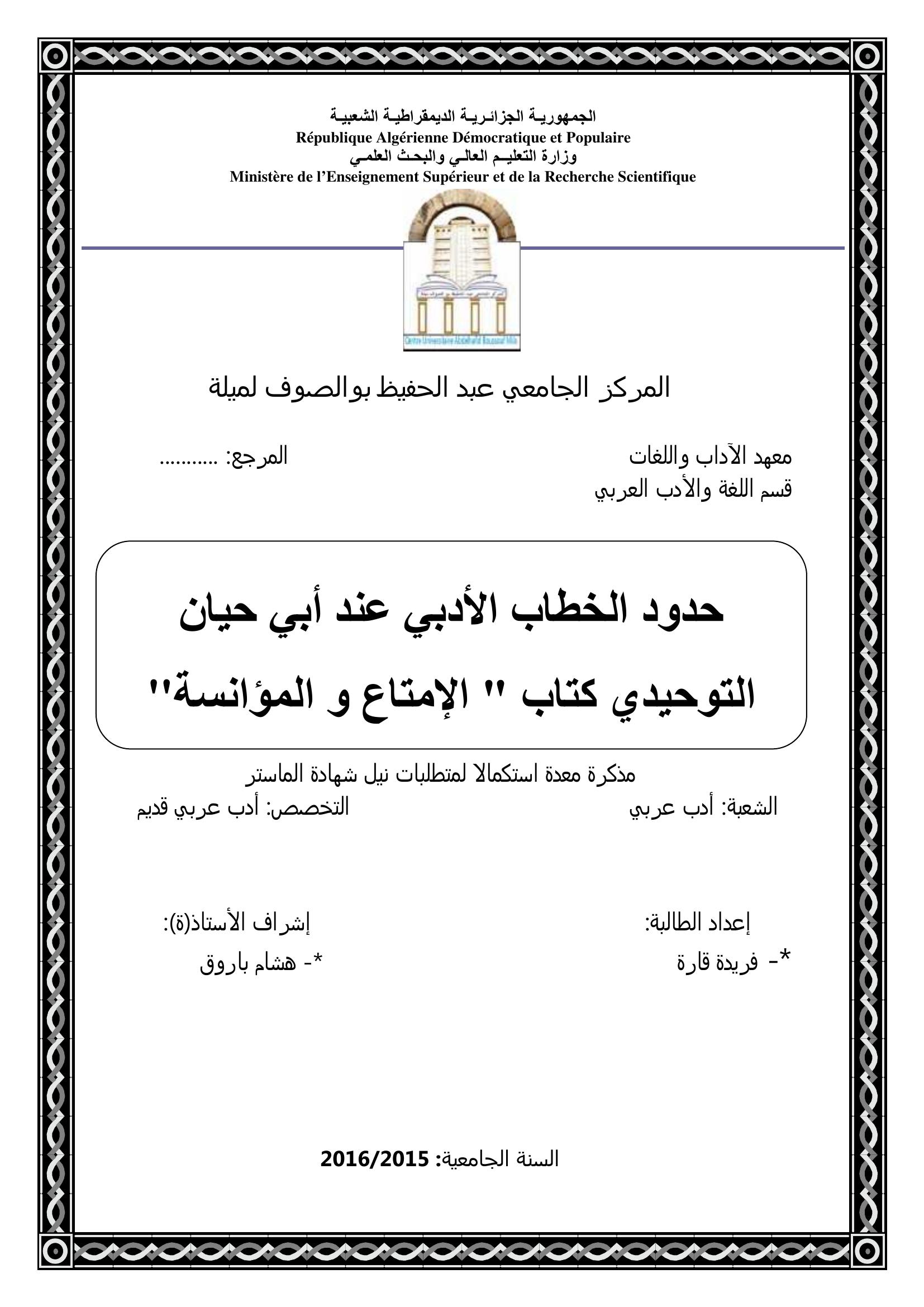 قارةفريدة & باروق هشام( مشرفا) (2016). حدود الخطاب الأدبي في كتاب "الامتاع والمؤانسة "لأبي حيان التوحيدي ".