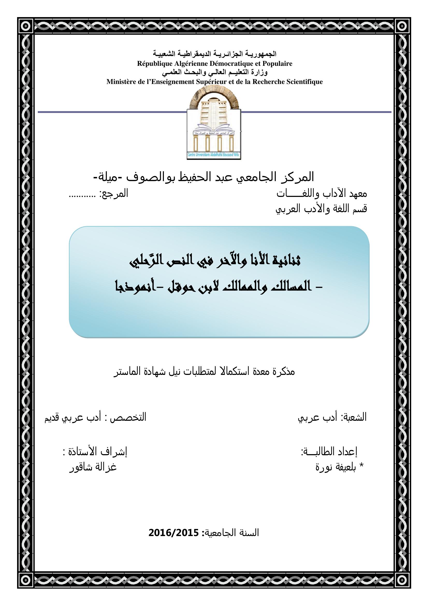 بلعيفة نورة & شاقور غزالة ( مشرفا) (2016). ثنائية الأنا والآخر في النص الرحلي المسالك والممالك لابن حوقل أنموذجا.