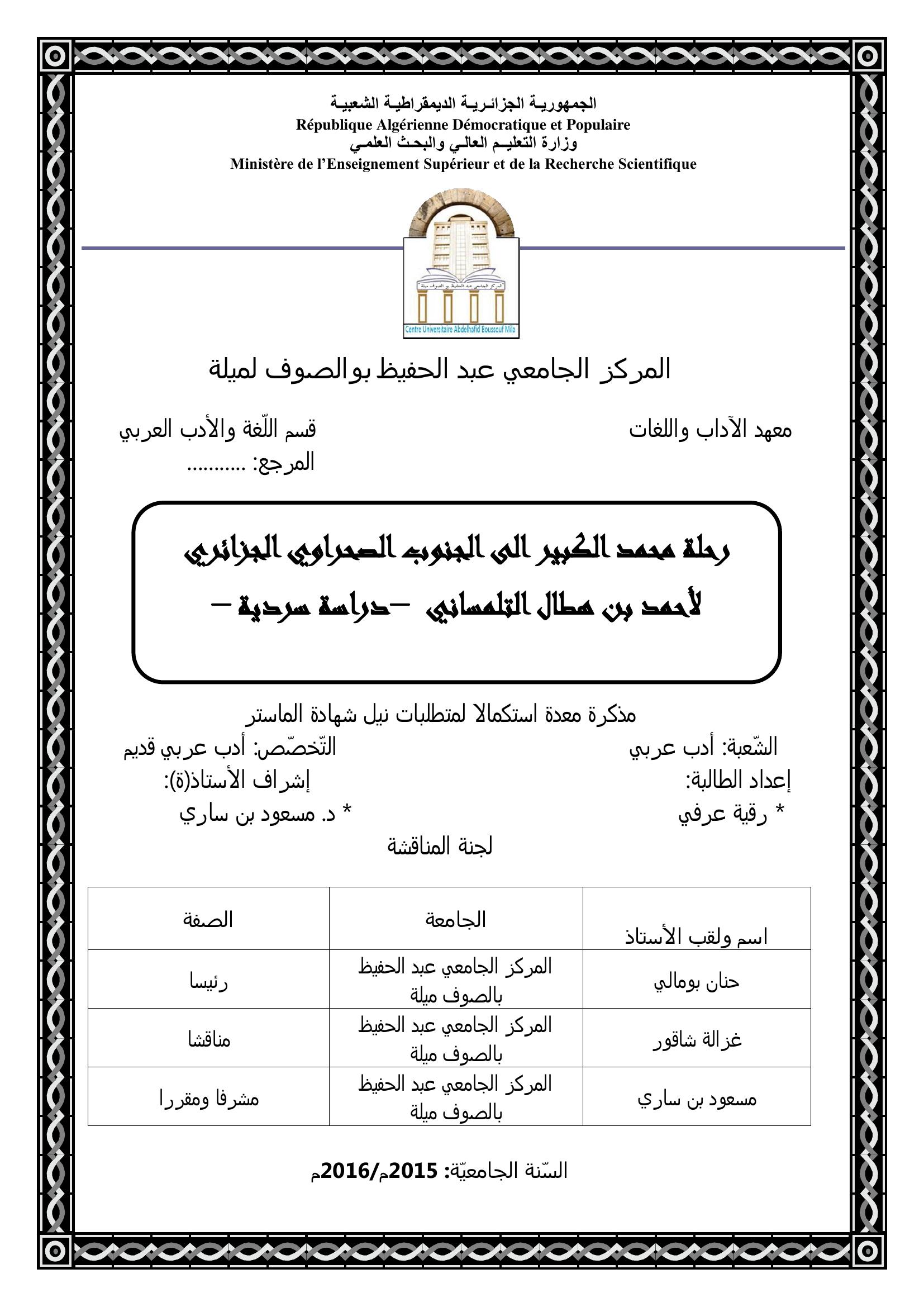 عرفي رقية & بن ساري مسعود(مشرفا) (2016). رحلة محمد الكبير إلى الجنوب الصحراوي الجزائري لأحمد بن هطال التلمساني دراسة سردية.