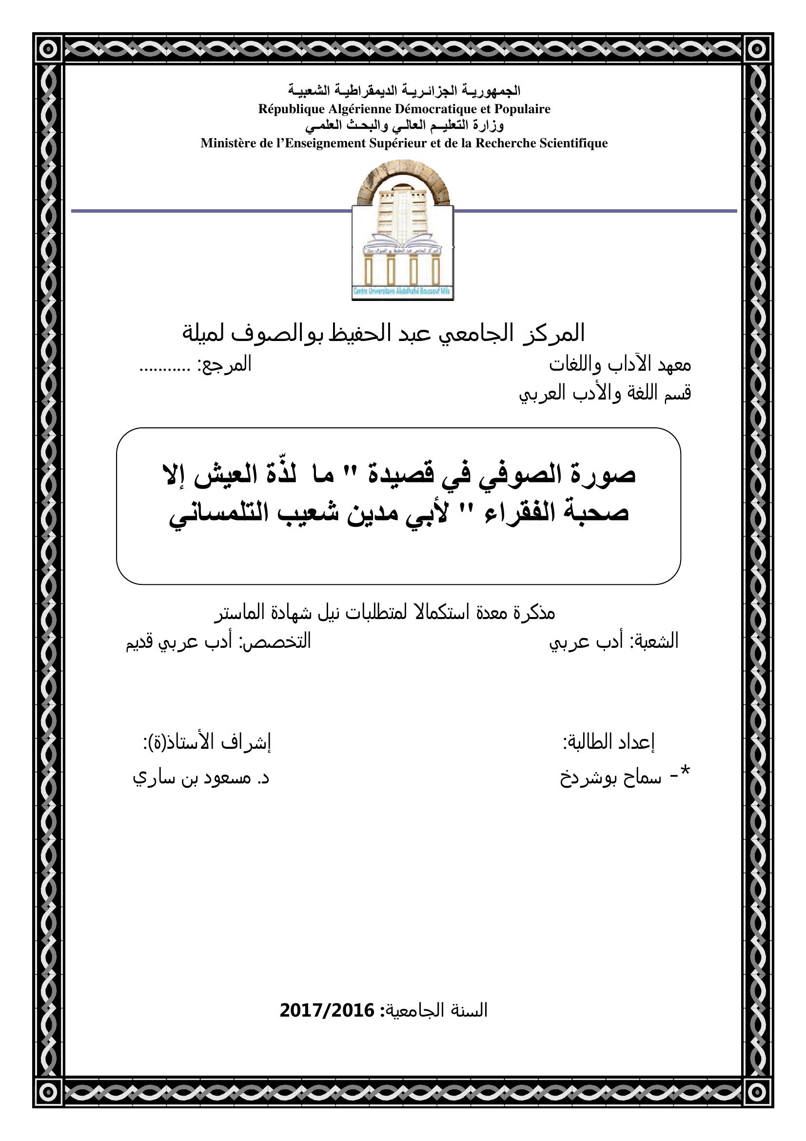 بوشردخ سماح & بن ساري مسعود(مشرفا) (2016). صورة الصوفي في قصيدة ما لذة العيش إلا صحبة الفقراء لأبي مدين شعيب التلمساني.