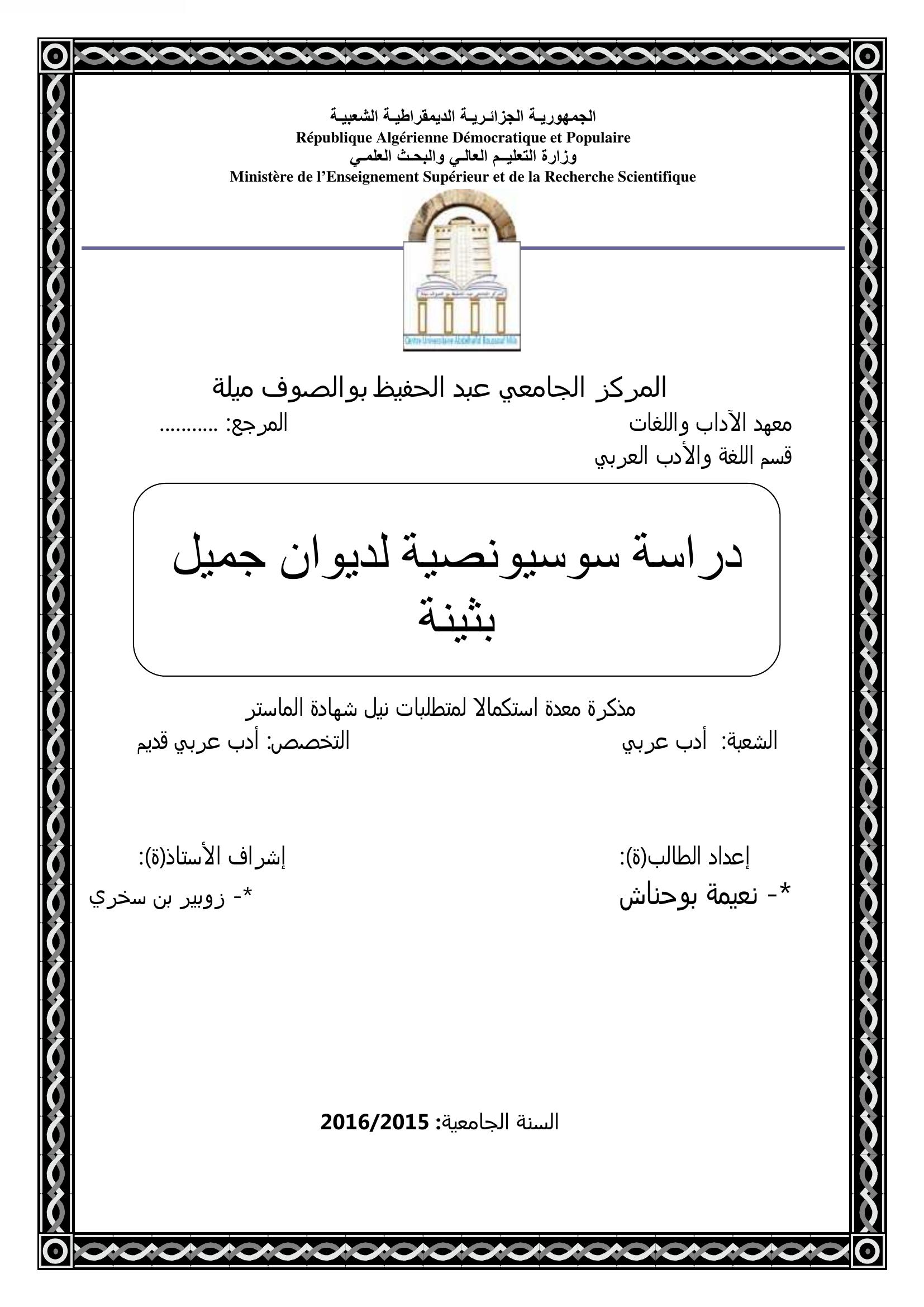 بوحناش نعيمة & بن صخري الزبير( مشرفا) (2016). دراسة سوسيو نصية لديوان جميل بثينة.