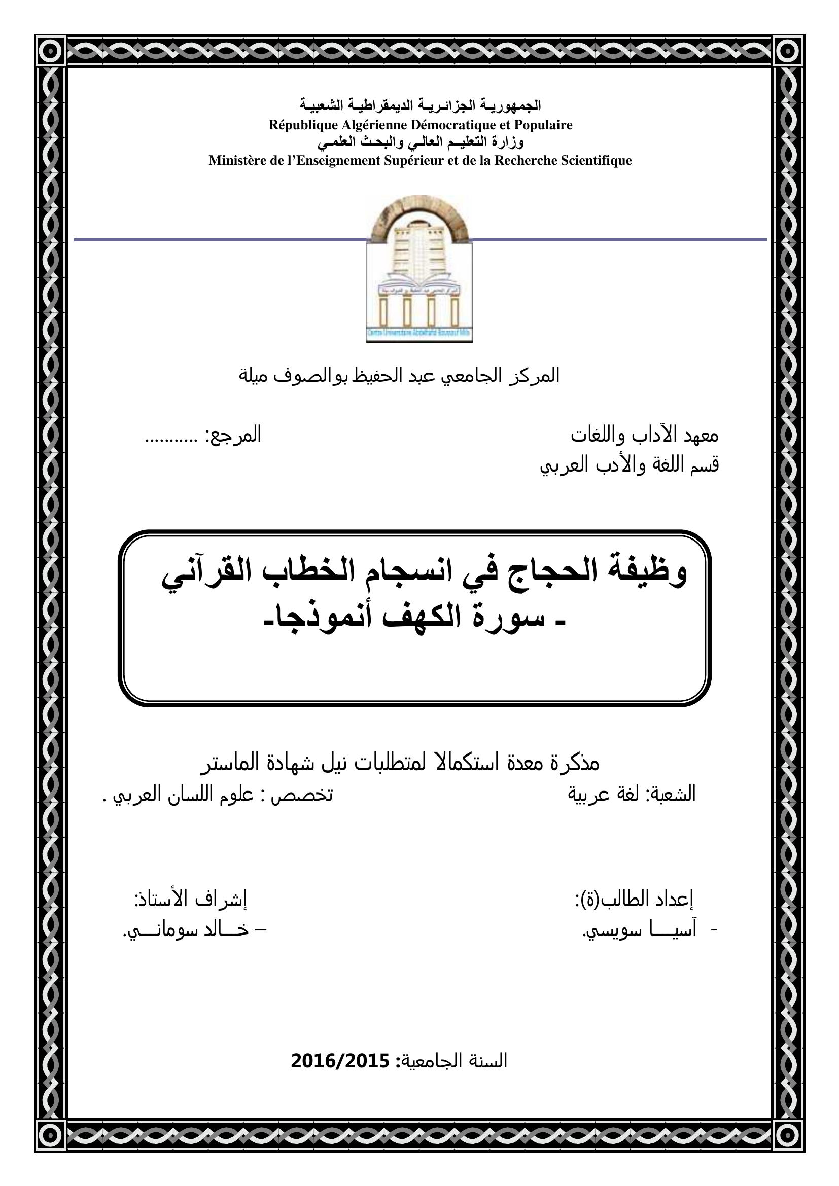 سويسي أسيا & سونامي خالد (مشرفا) (2016). وظيفة الحجاج في إنسجام الخطاب القرآني سورة الكهف أنموذجا.