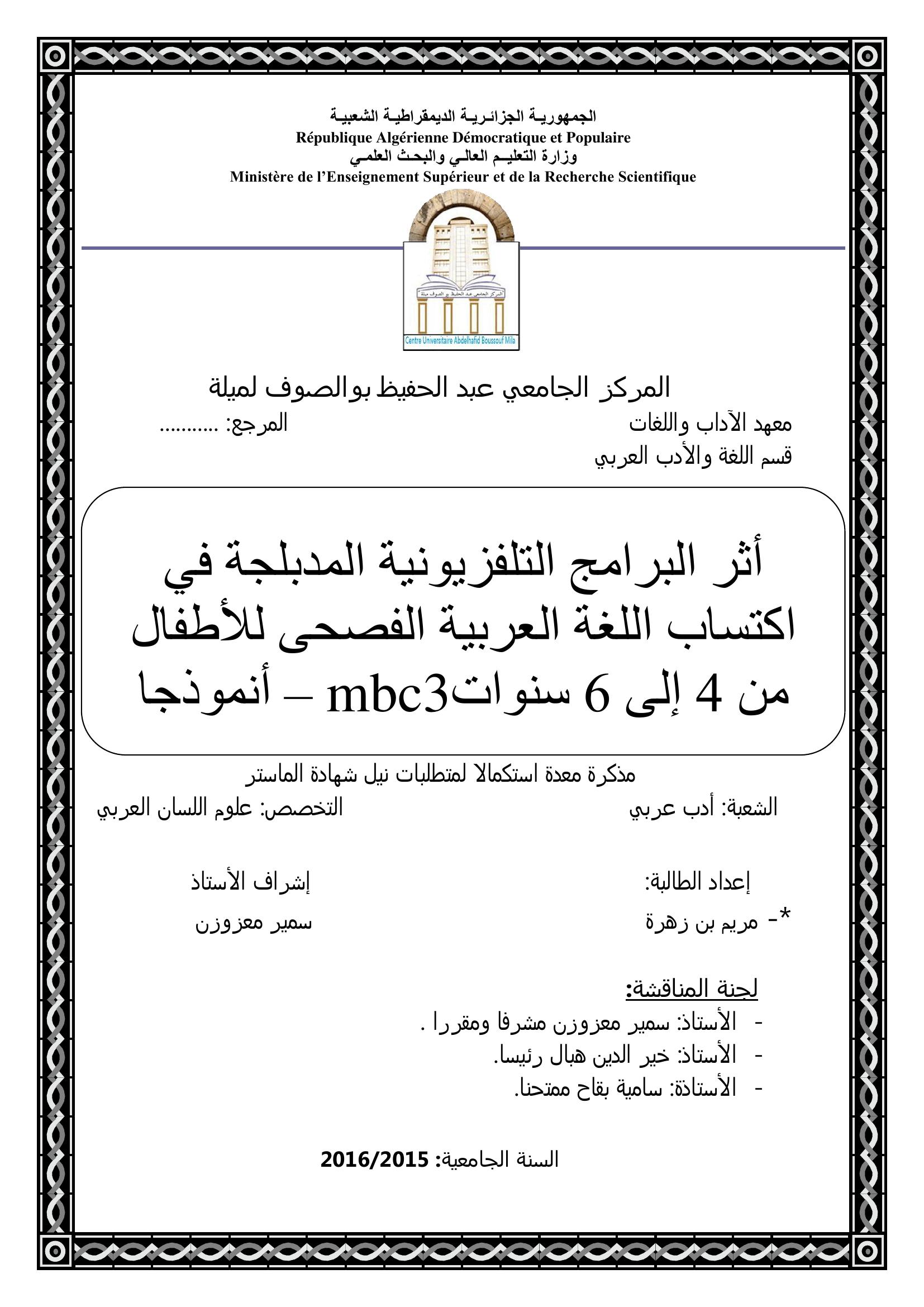 بن زهرة مريم & معزوزن سمير (مشرفا) (2016). أثر البرامج التلفزيونية المدبلجة في إكتساب اللغة العربية الفصحى للأطفال من 4 إلى 6 سنوات mbc3 أنموذجا.