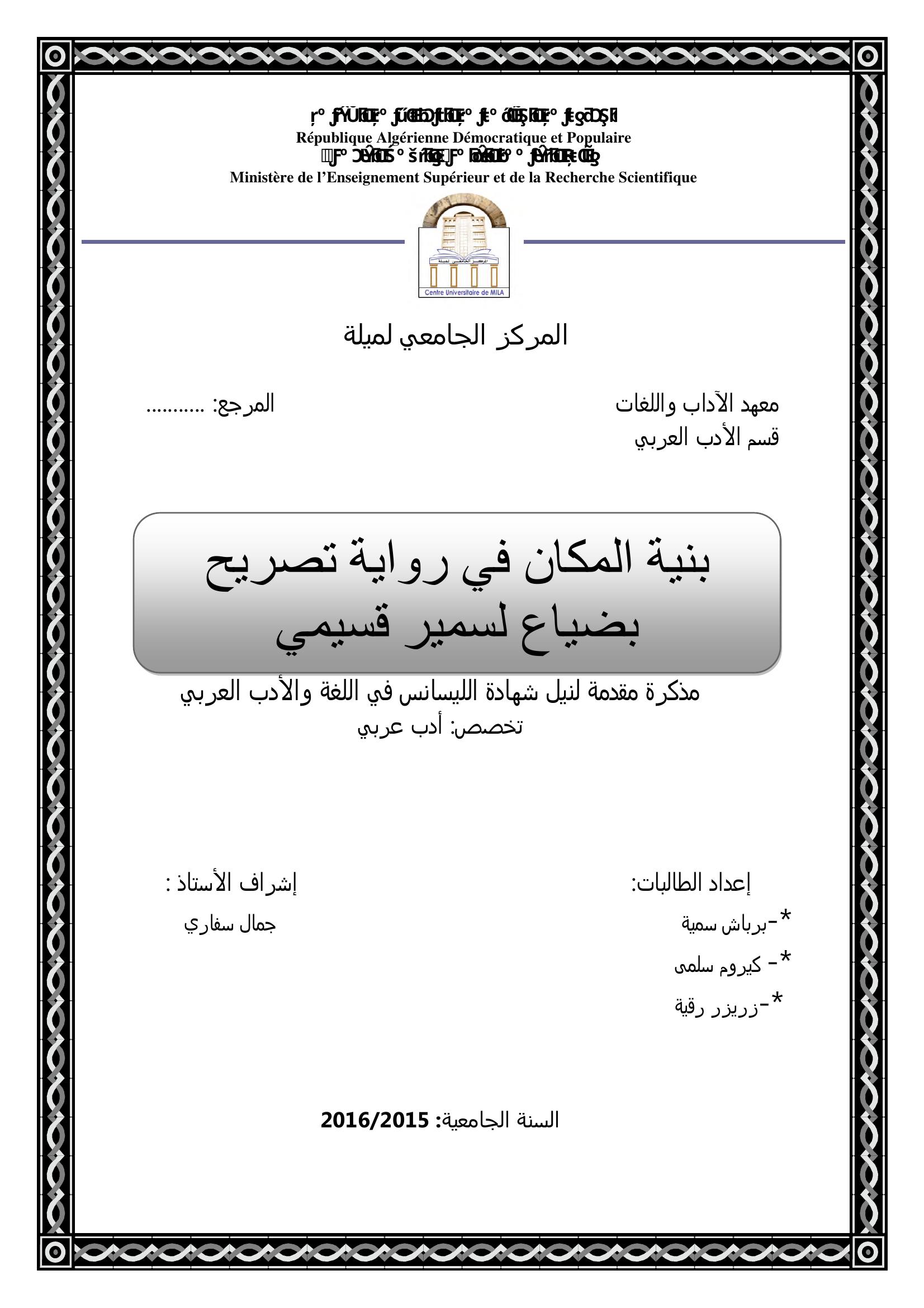 برباش سمية et al. (2016). بنية المكان في رواية تصريح بضياع لسمير قسيمي.