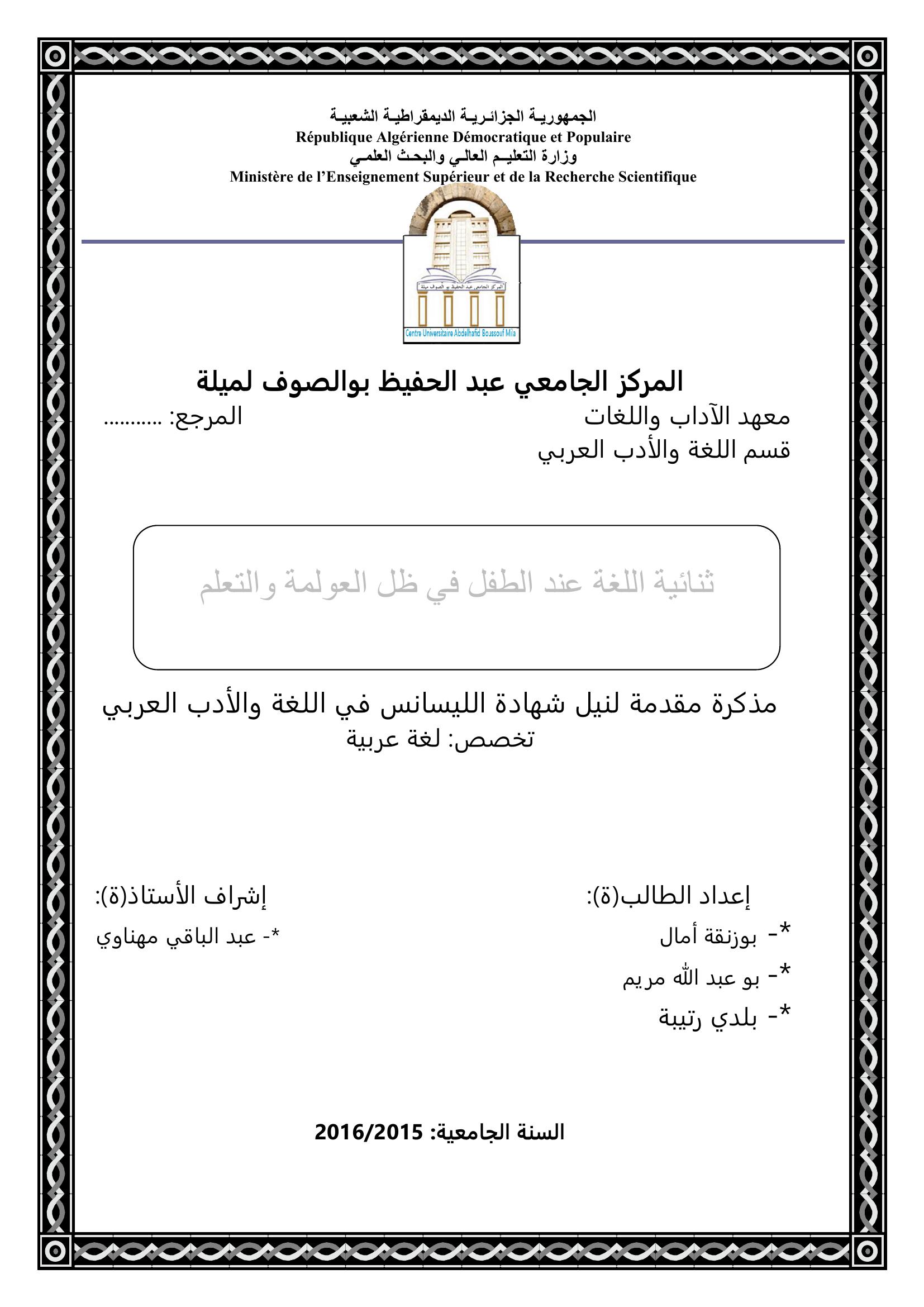 بوزنقة آمال et al. (2016). ثنائية اللغة عند الطفل في ظل العولمة والتعلم.