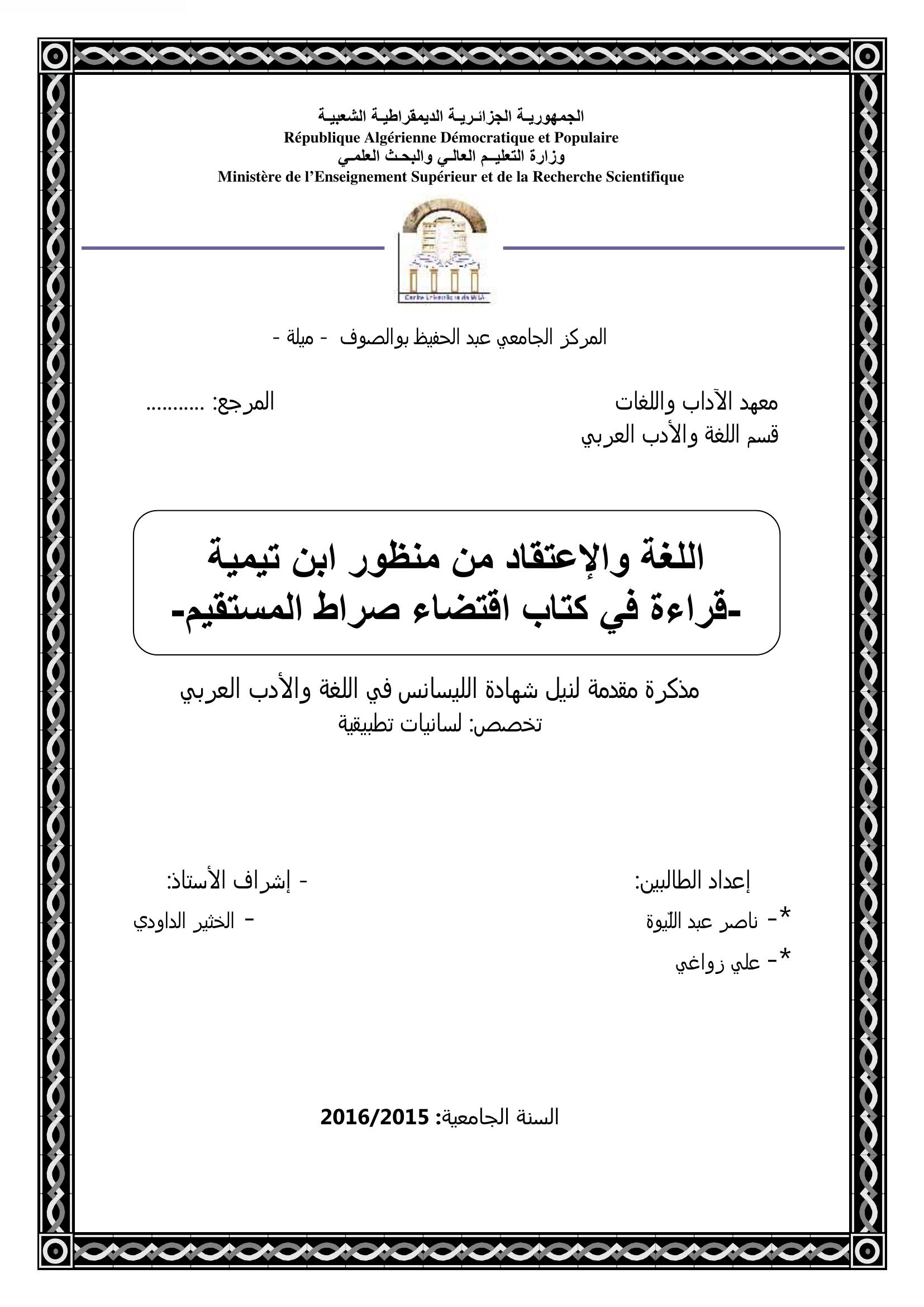 عبد الليوة ناصر & الخثير داودي (مشرفا) (2016). اللغة والإعتقاد من منظور ابن تميمة قراءة في كتاب إقتضاء سراط مستقيم.