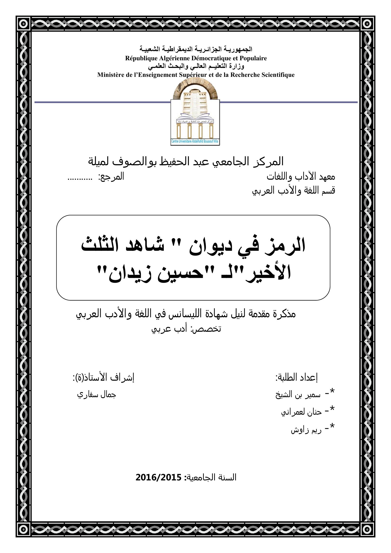 بن الشيخ سمير et al. (2016). الرمز في ديوان شاهد الثلث الأخير لحسين زيدان.