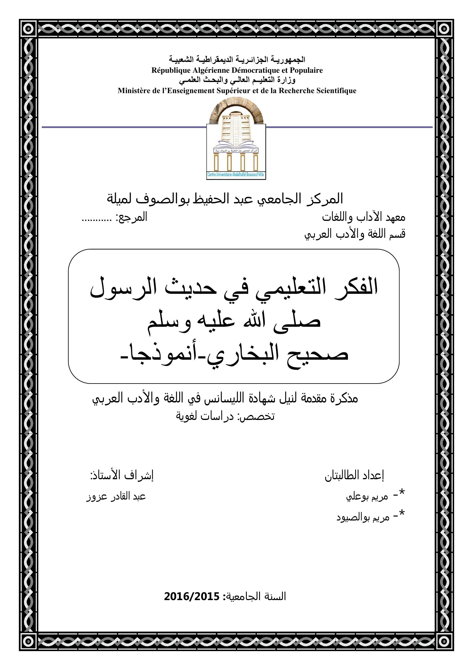 بوعلي مريم et al. (2016). الفكر التعليمي في حديث الرسول صلى الله عليه وسلم صحيح البخاري أنموذجا.
