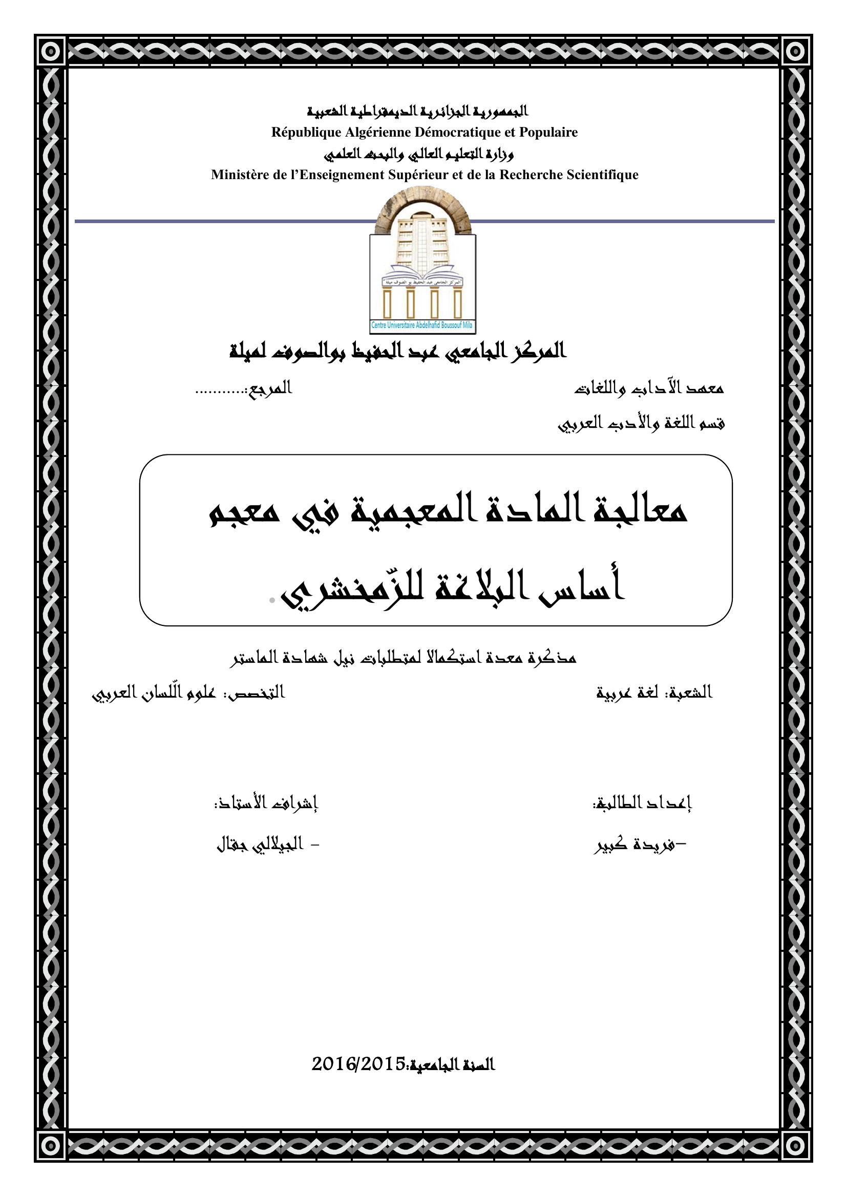 كبير فريدة & جقال الجيلالي (مشرفا) (2016). معالجة المادة المعجمية في معجم أساس البلاغة للزمخشري.