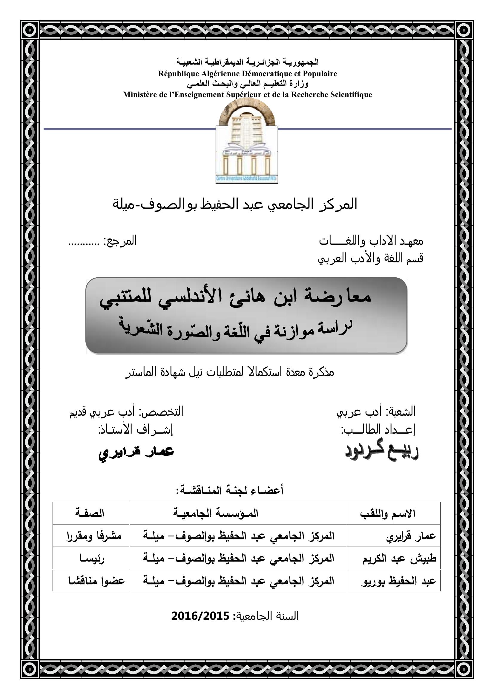 كردود ربيع & قرايري عمار (مشرفا) (2016). معارضة ابن هانئ الأندلسي للمتنبي دراسة موازنة في اللغة والصورة الشعرية.