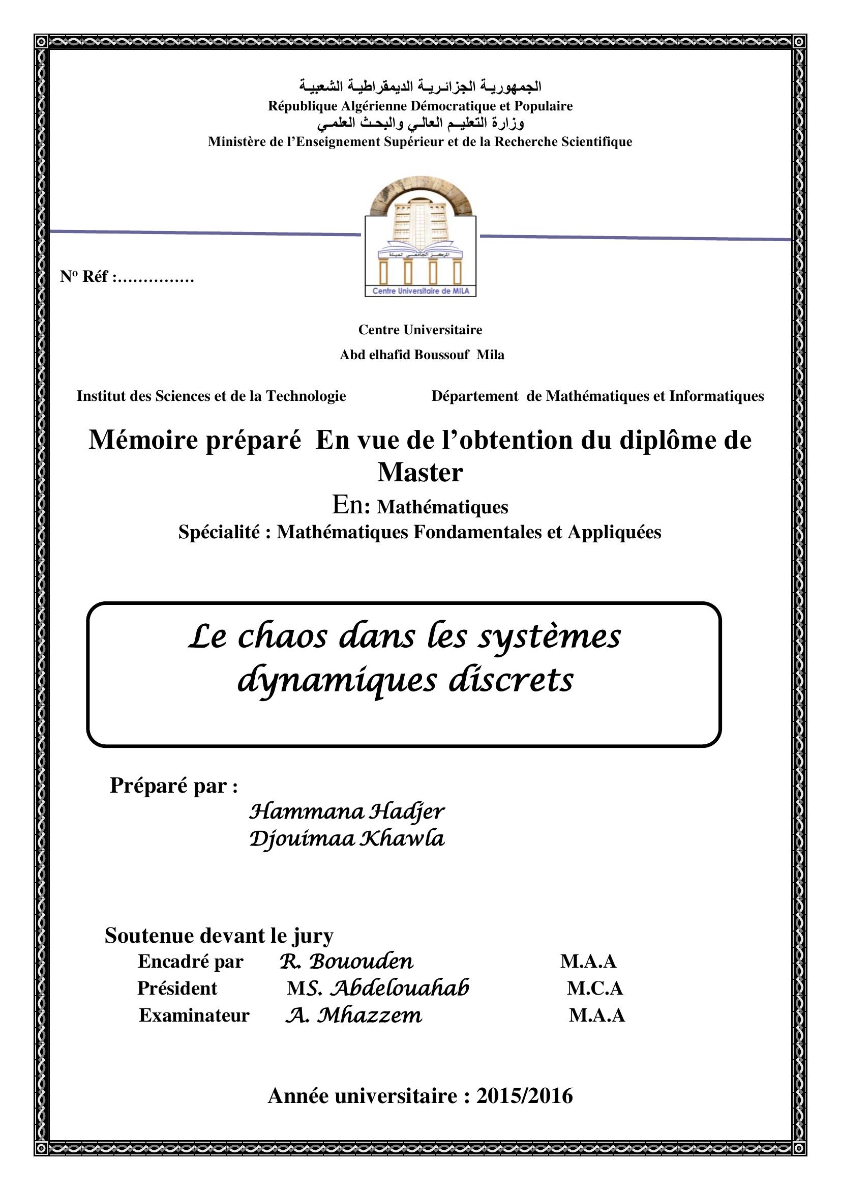 Hammana Hadjer & Bououden .R(Encadreur), M. (2016). Le chaos dans les systémes dynamiques discrets.