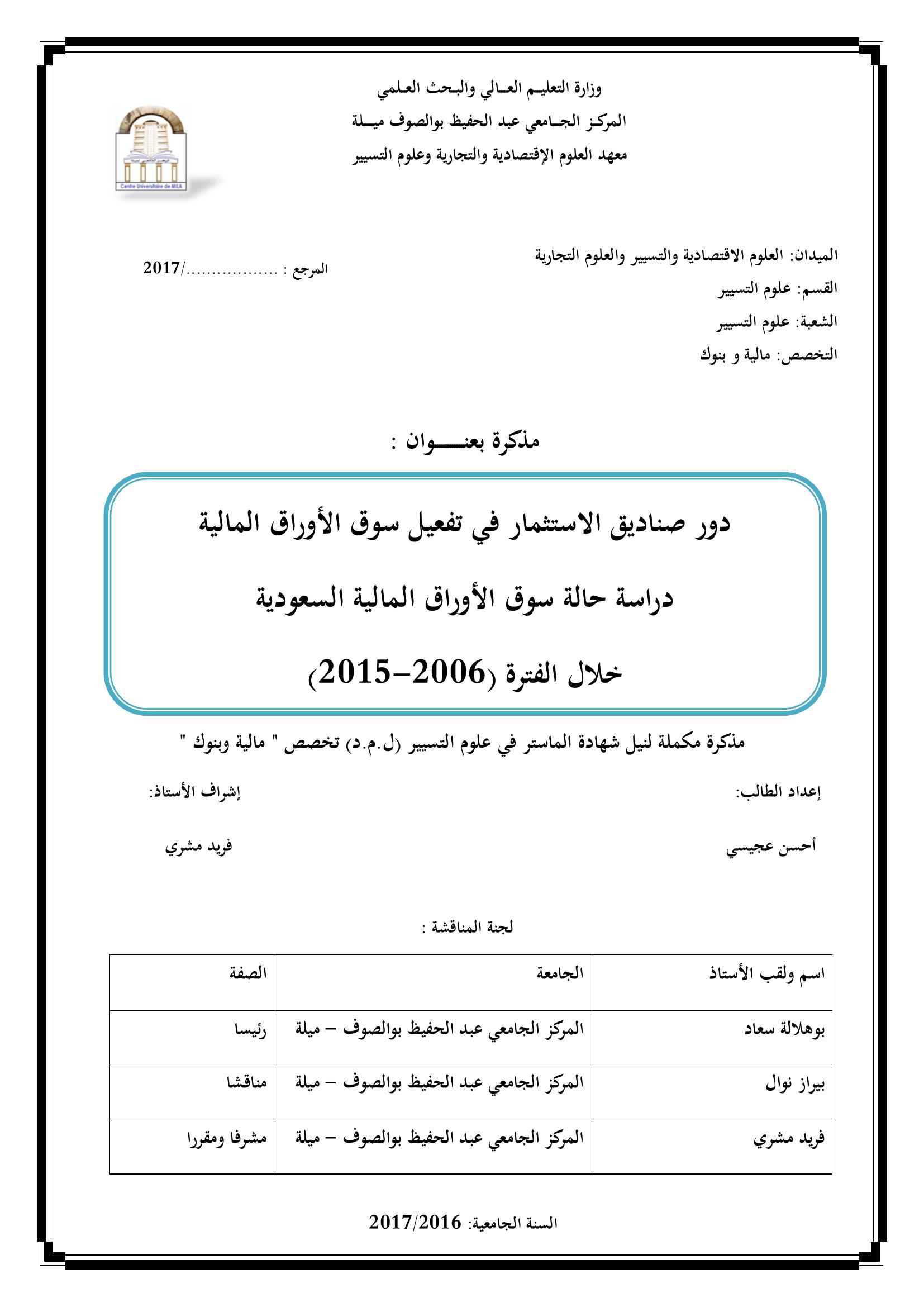 دور صناديق الإستثمار في تفعيل سوق الأوراق المالية : دراسة حالة سوق الاوراق المالية السعودية خلال الفترة (2006-2015)