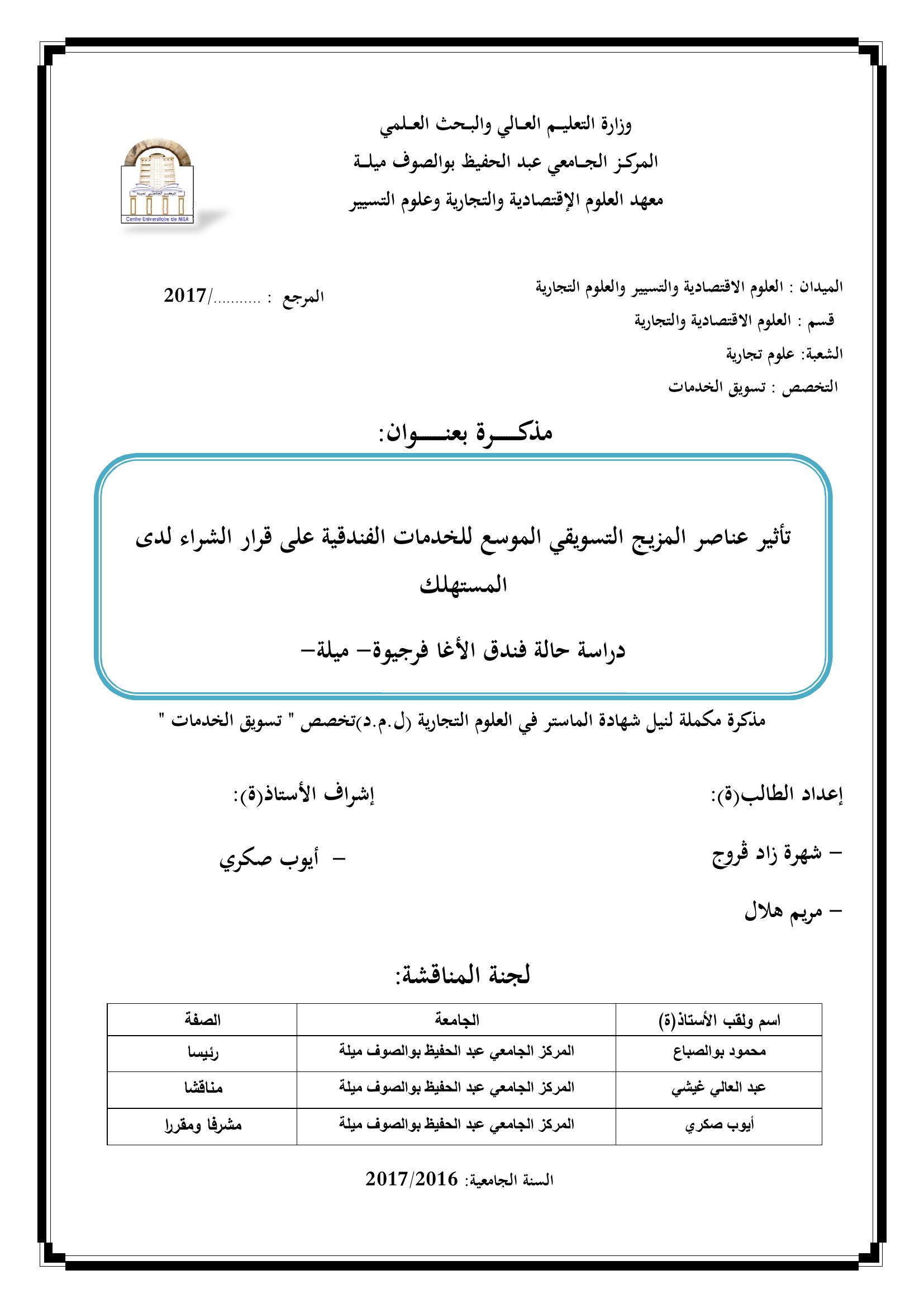شهرة زاد قروج & محمود بوالصباع (رئيسا), ع. (2017). تأثير عناصر المزيج التسويقي الموسع للخمات الفندقية على قرار الشراء لدى المستهلك : دراسة حالة فندق الأغا فرجيوة ميلة.