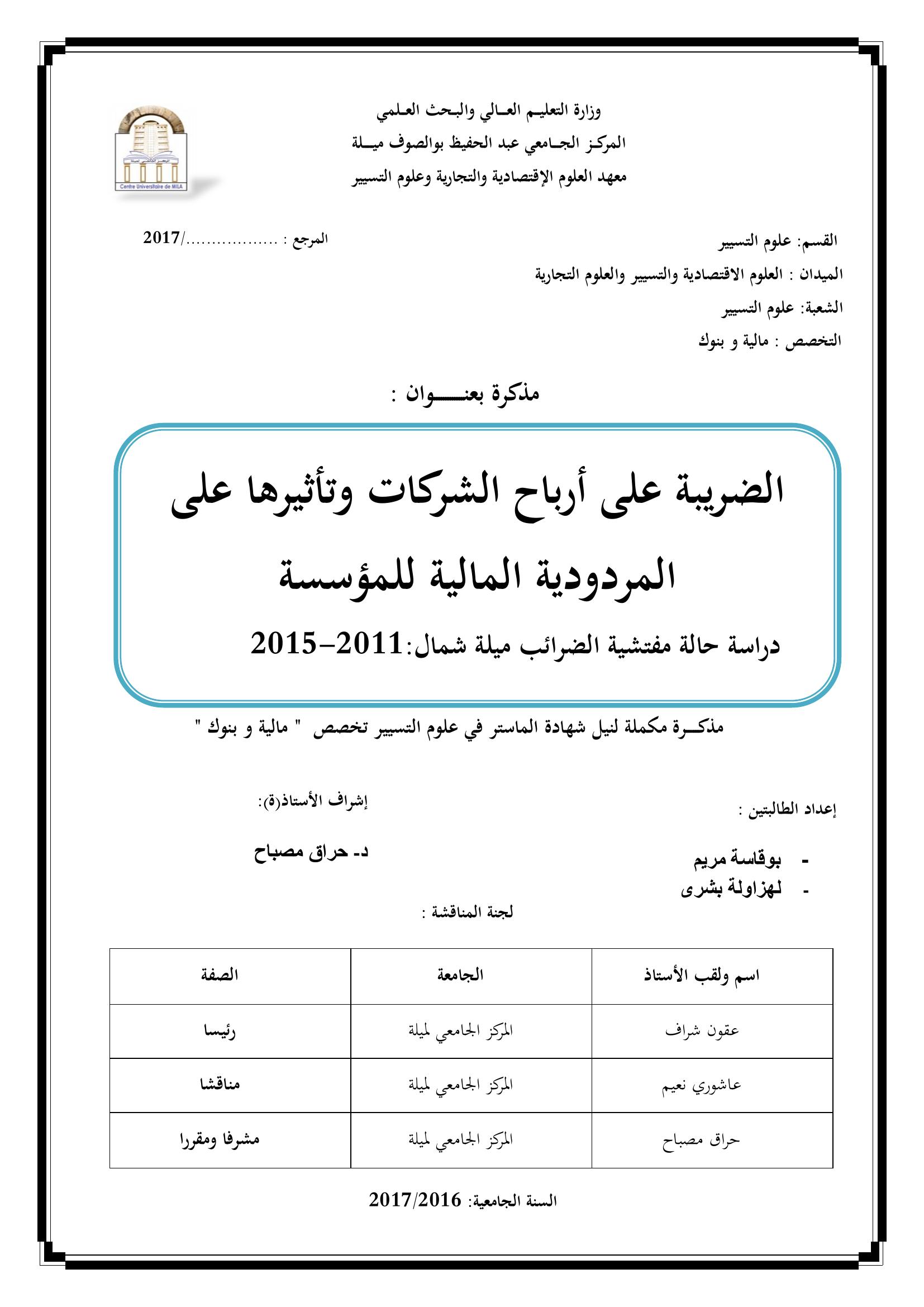 بوقاسة مريم & عقون شراف (رئيسا), ع. (2017). الضريبة على أرباح الشركات وتأثيرها على المردودية المالية للمؤسسة : دراسة حالة مفتشية الضرائب ميلة شمال: 2011-2015.