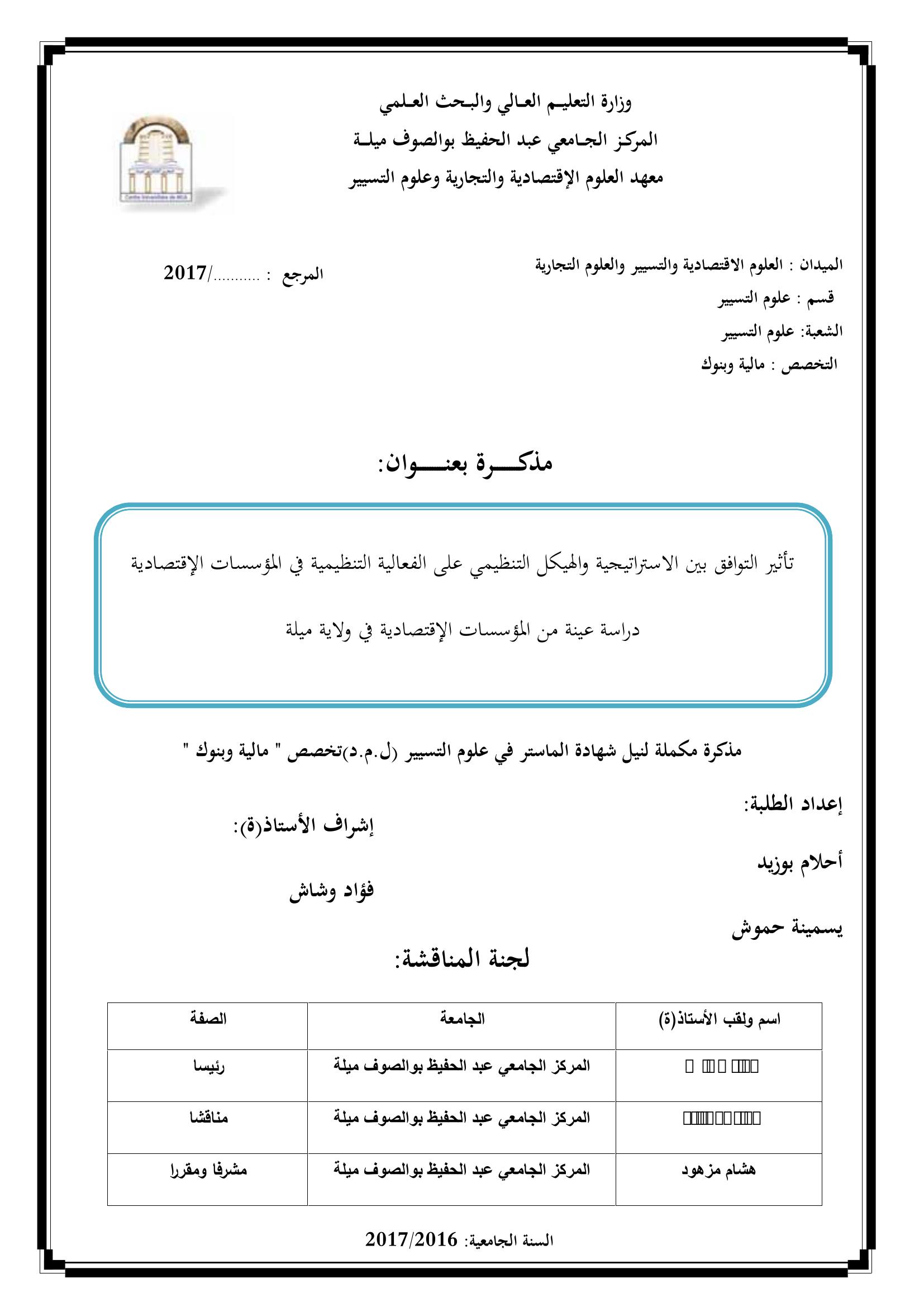 تأثير التوافق بين الإستراتيجية والهيكل التنظيمي على الفعالية التنظيمية في المؤسسات الإقتصادية : دراسة عينة من المؤسسات الإقتصادية في ولاية ميلة