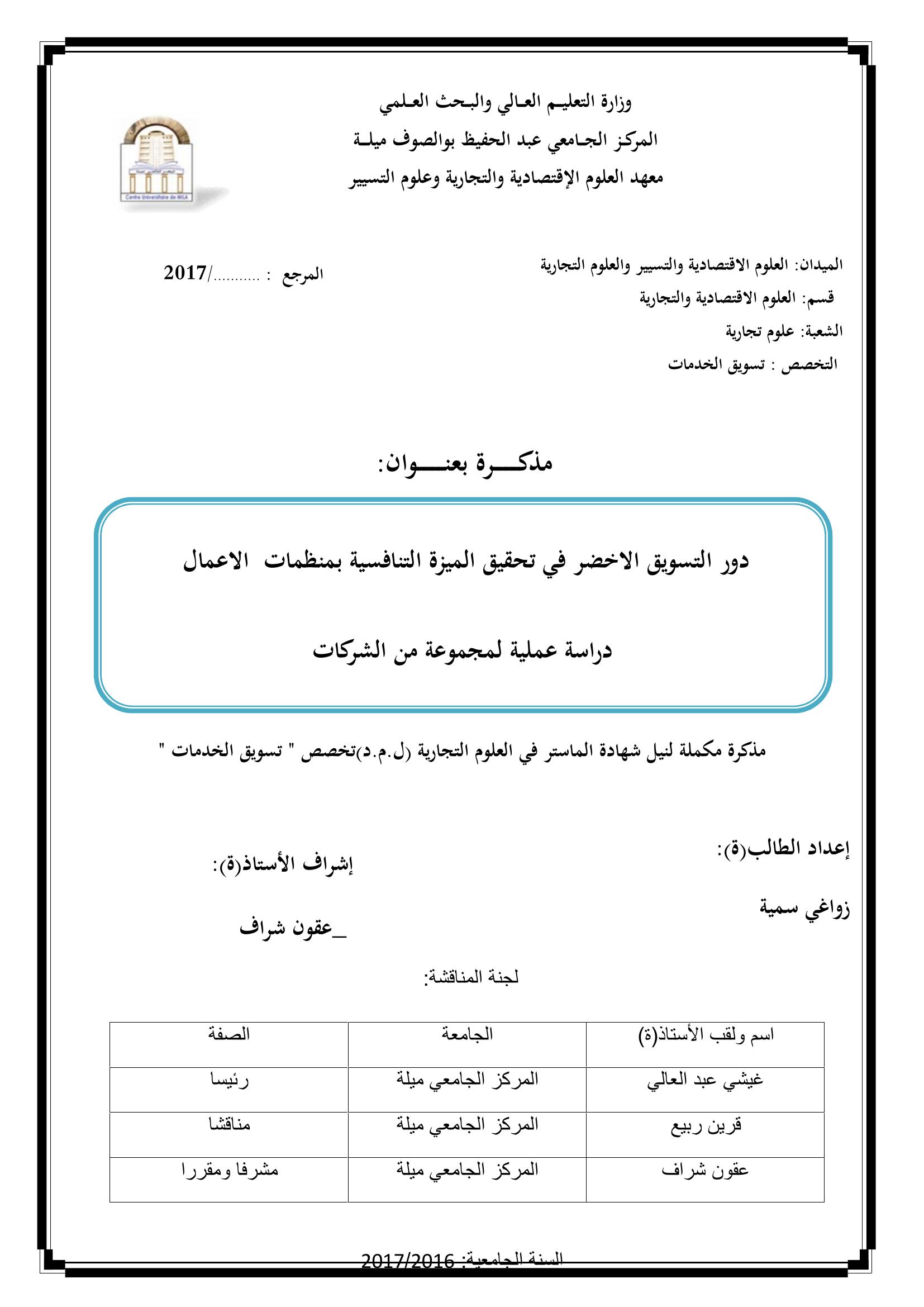 زواغي سمية & غيشي عبد العالي(رئيسا), ق. (2017). دور التسويق الأخضر في تحقيق الميزة التنافسية بمنظمات الأعمال :دراسة عملية لمجموعة من الشركات.
