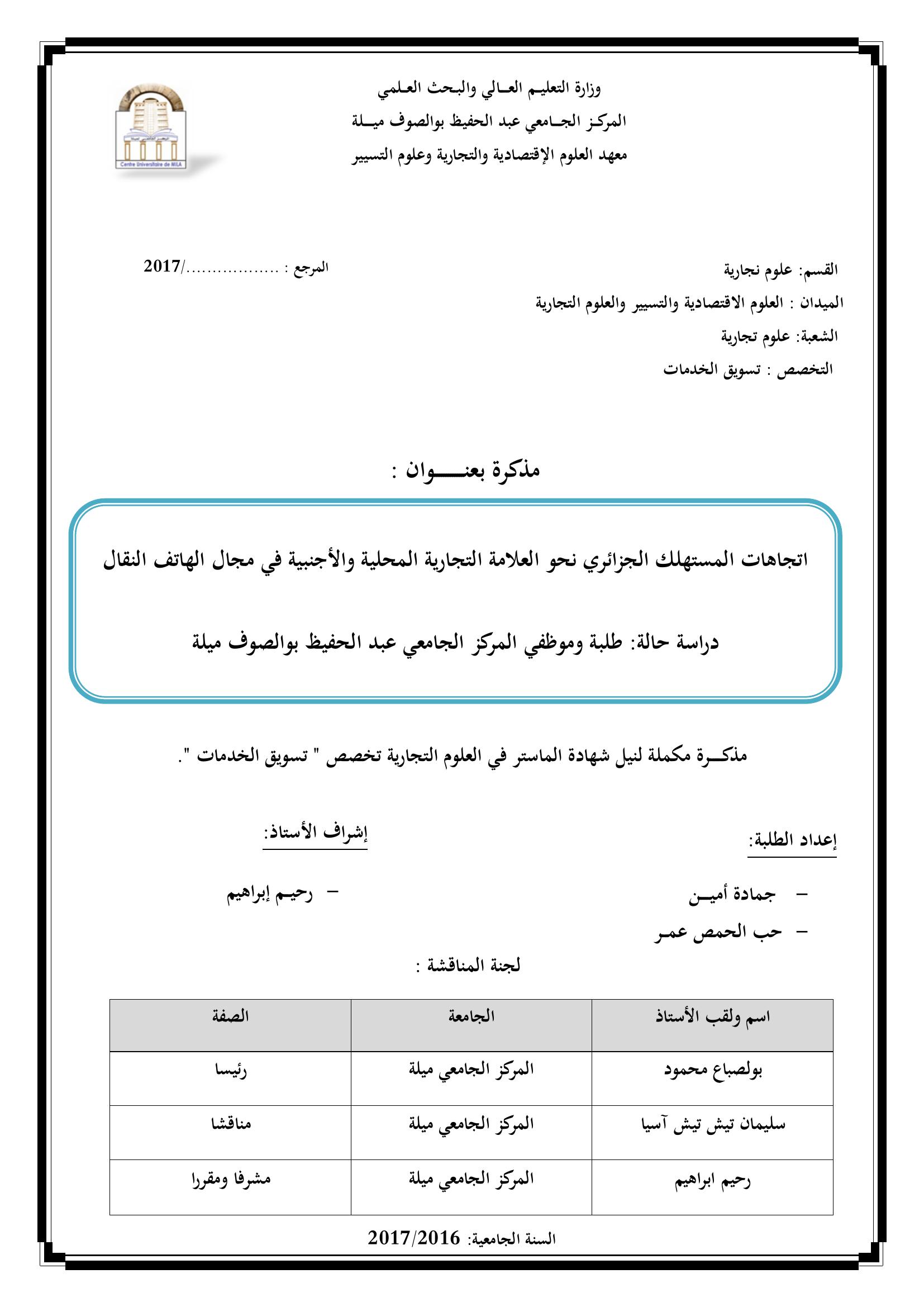 اتجاهات المستهلك الجزائري نحو العلامة التجارية المحلية والأجنبية في مجال الهاتف النقال : دراسة حالة طلبة وموظفي المركز الجامعي عبد الحفيظ بوالصوف ميلة