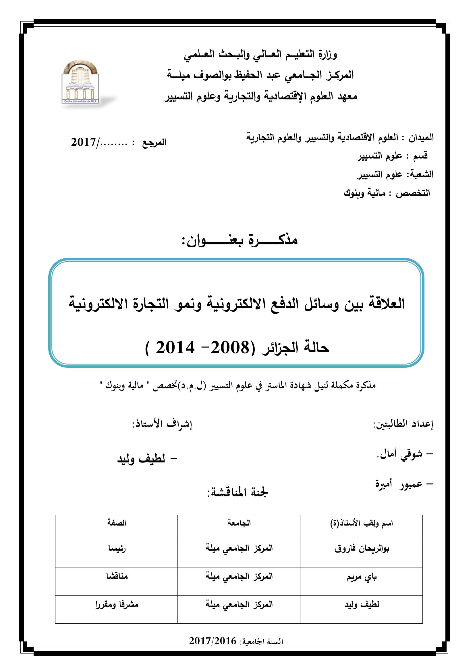 شوقي آمال & بوالريحان فاروق (رئيسا), ب. (2017). العلاقة بين وسائل الدفع الإلكترونية ونمو التجارة الإلكترونية : حالة الجزائر (2008-2014).