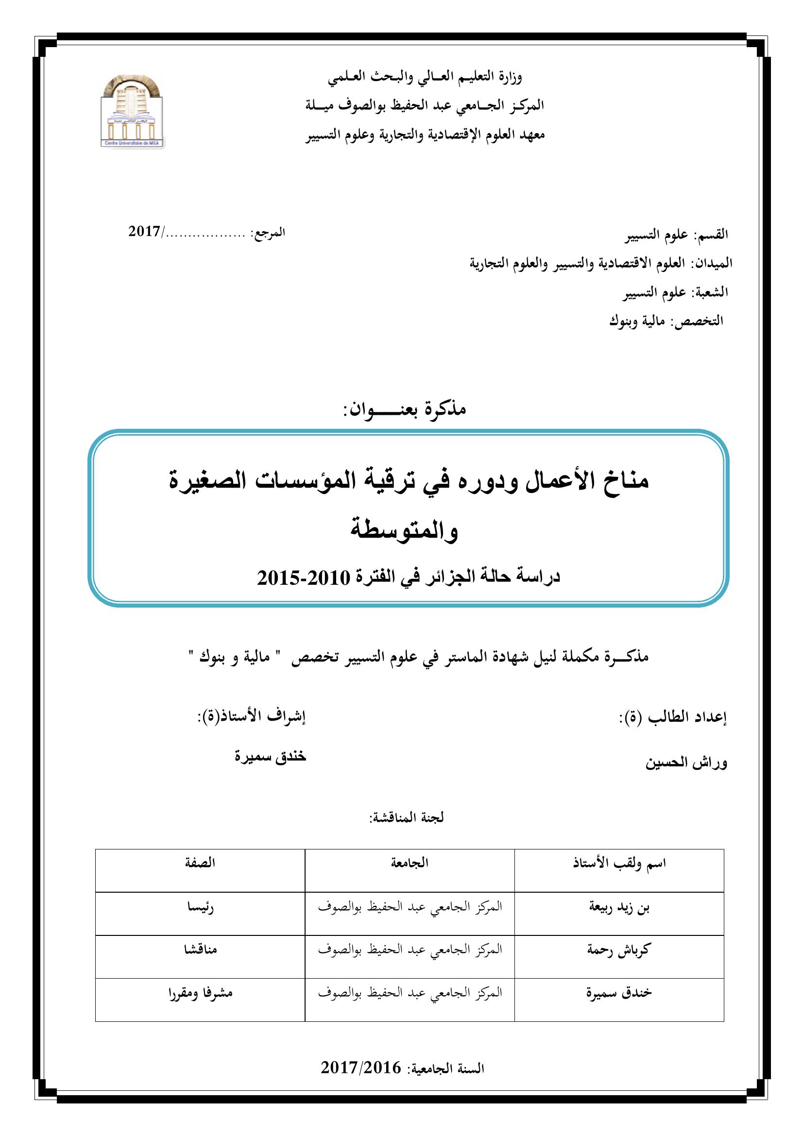 مناخ الأعمال ودوره في ترقية المؤسسات الصغيرة والمتوسطة : دراسة حالة الجزائر في الفترة 2010-2015