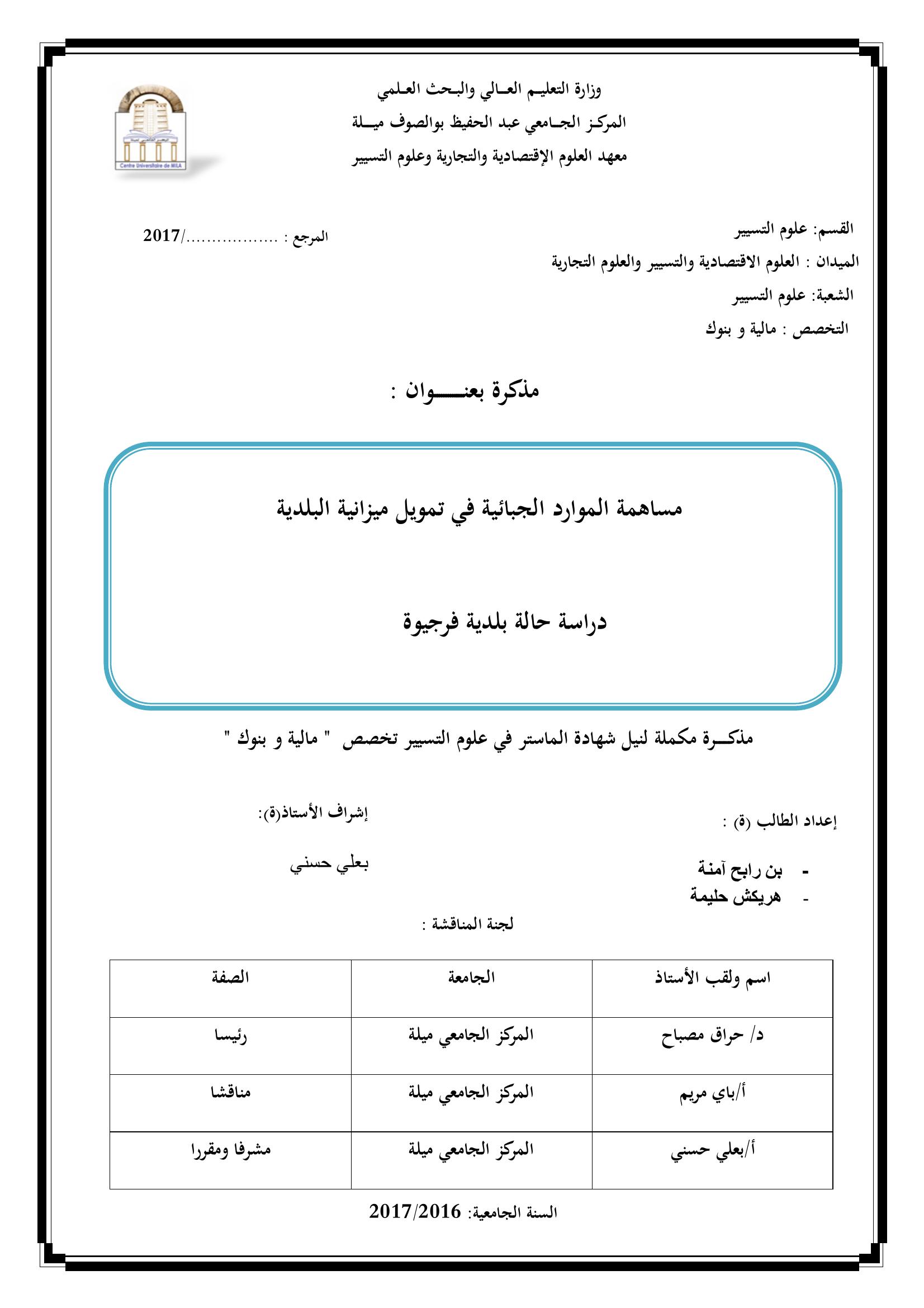 مساهمة الموارد الجبائية في تمويل ميزانية البلدية : دراسة حالة بلدية فرجيوة الفترة 2011-2015