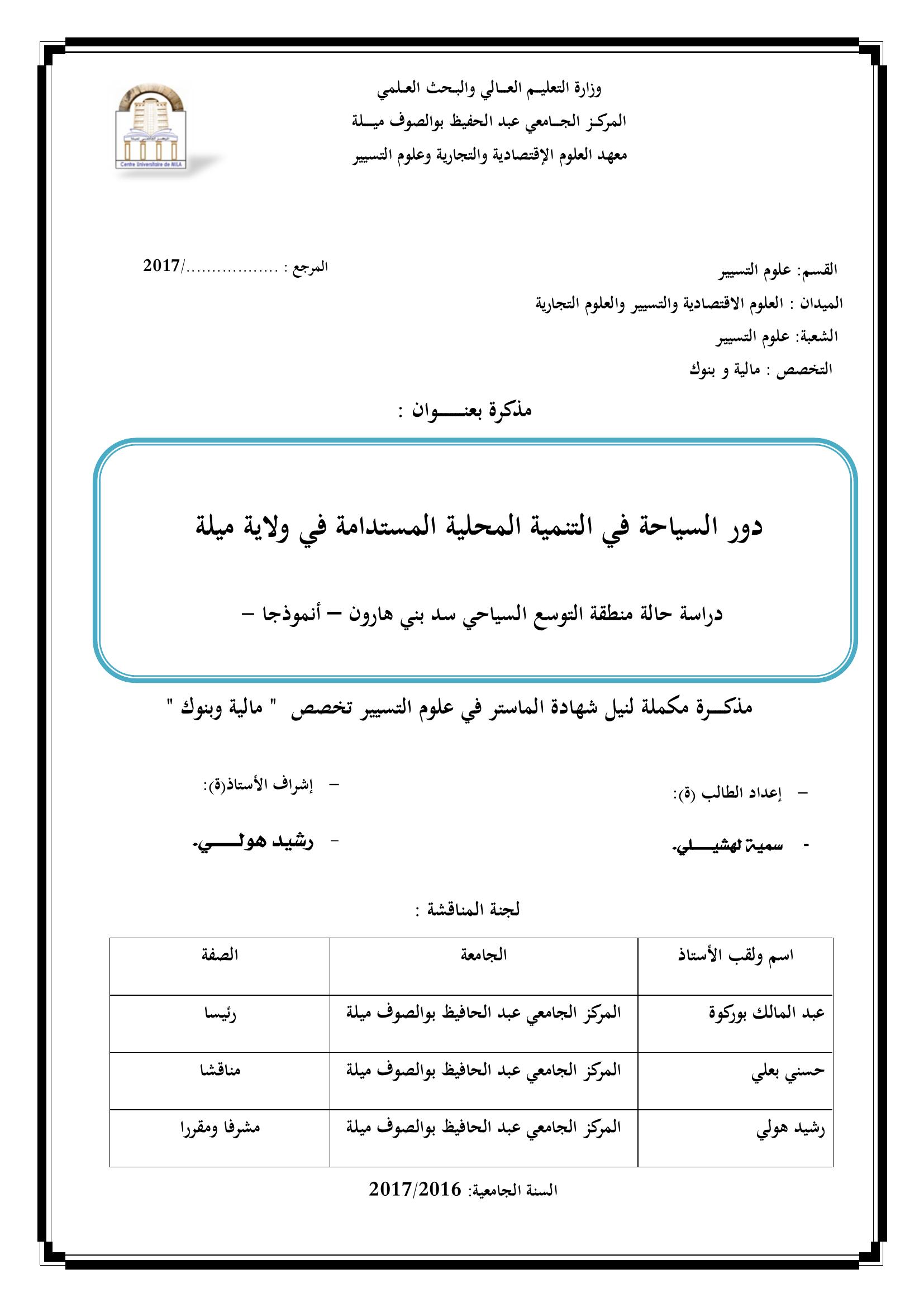 لهشيلي سمية & عبد المالك بوركوة (رئيسا), ح. (2017). دور السياحة في التنمية المحلية المستدامة في ولاية ميلة : دراسة حالة منطقة التوسع السياحي سد بني هارون أنموذجا.