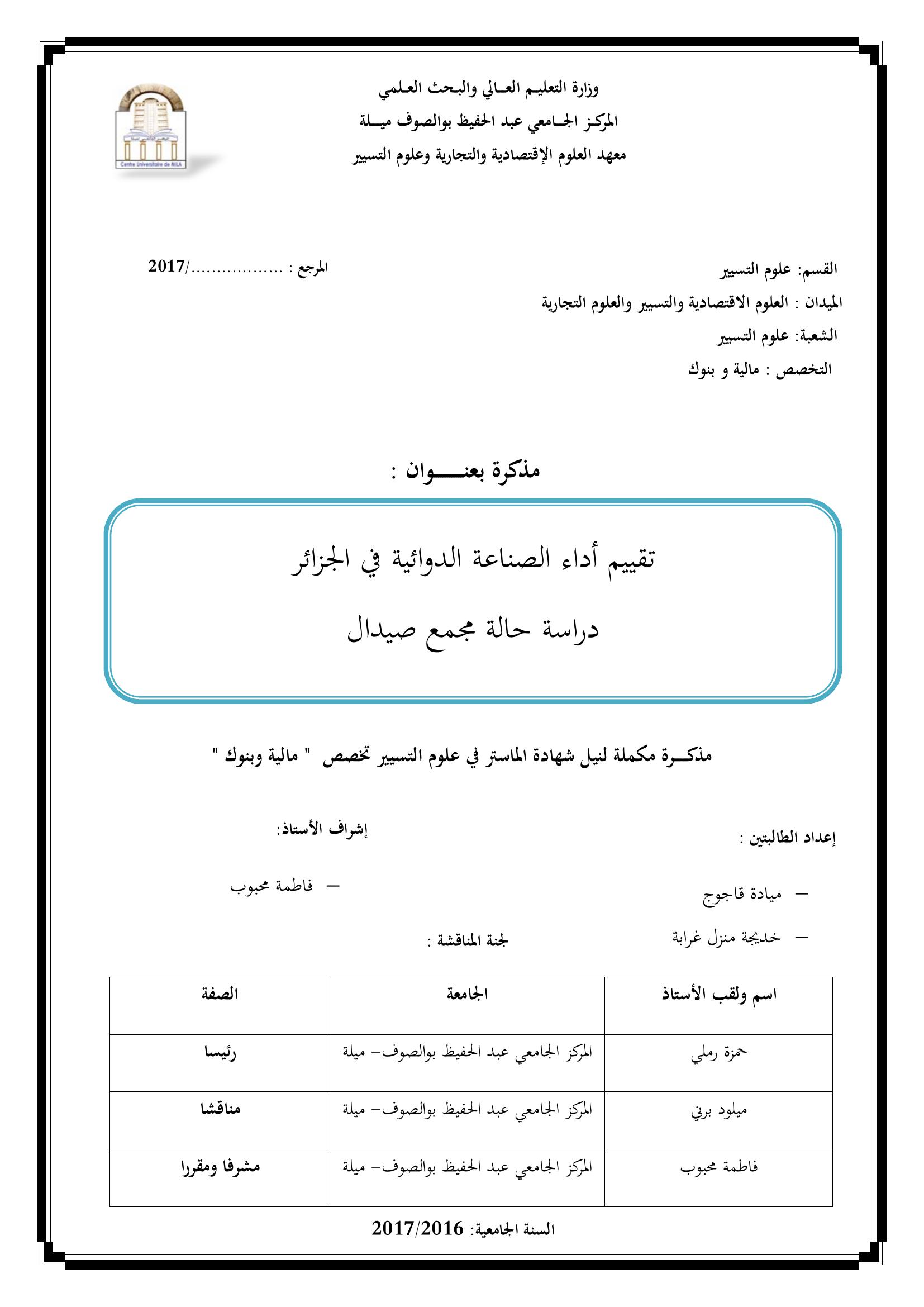 قاجوج ميادة & حمزة رملي (رئيسا), م. (2017). تقييم أداء الصناعة الدوائية في الجزائر : دراسة مجمع صيدال.