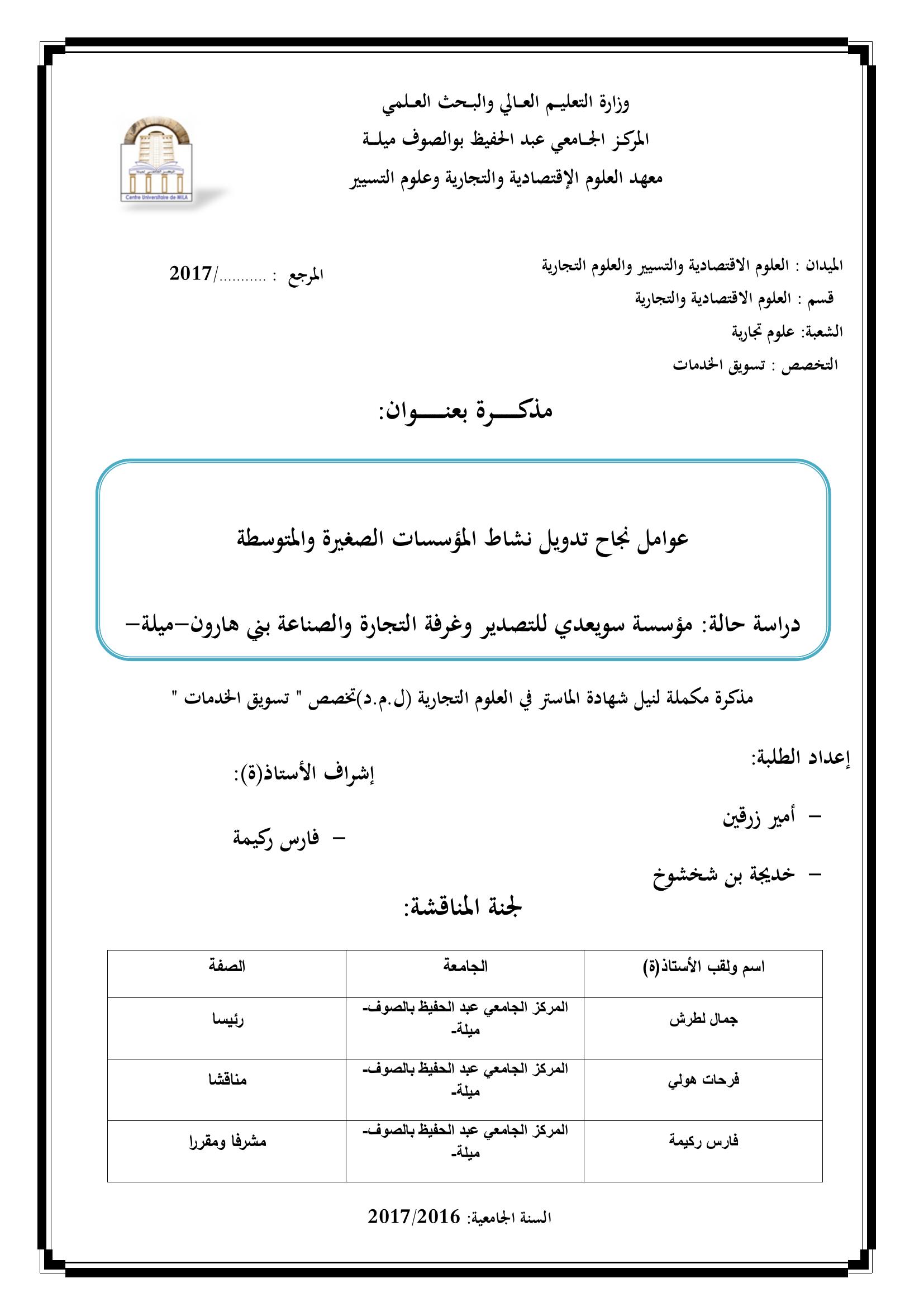 عوامل نجاح تدويل نشاط المؤسسات الصغيرة والمتوسطة : دراسة حالة مؤسسة سويعدي للتصدير وغرفة التجارة والصناعة بني هارون ميلة