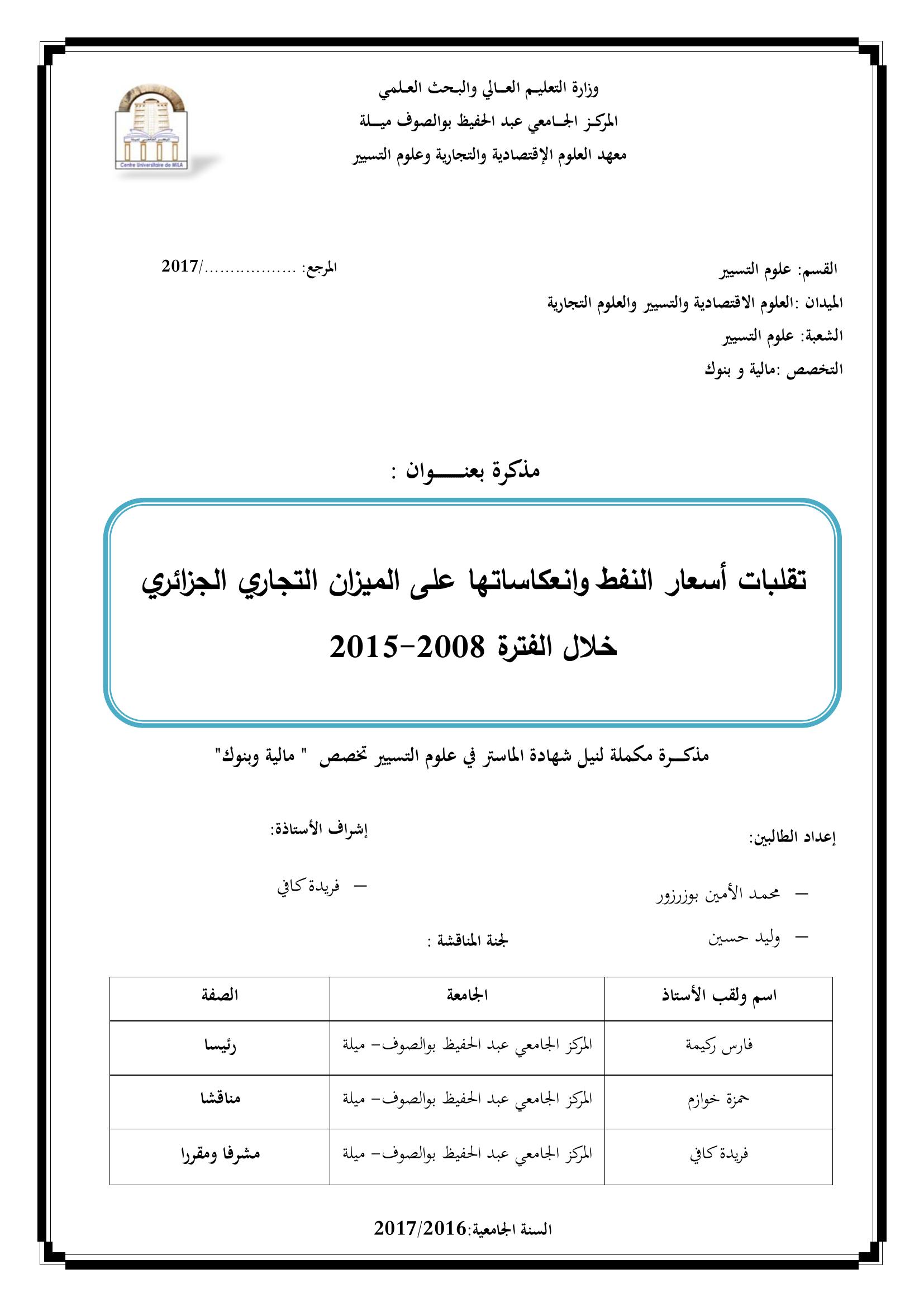 بوزرزور محمد الأمين & فارس ركيمة(رئيسا), ح. (2017). تقلبات أسعار النفط وانعكاساتها على الميزان التجاري الجزائري خلال الفترة 2008-2015.
