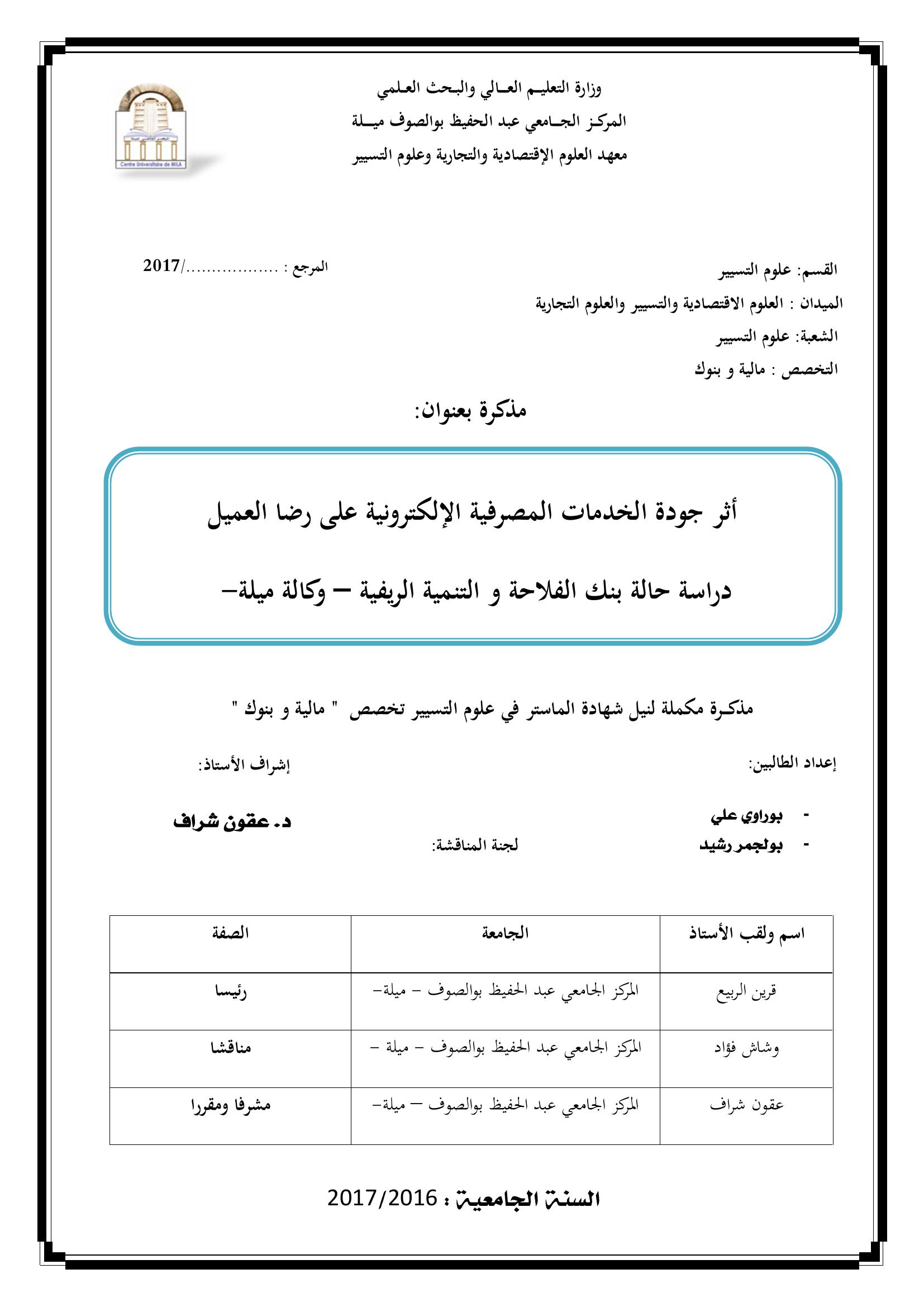 بولجمر رشيد & قرين الربيع (رئيسا), و. (2017). أثر جودة الخدمات المصرفية الإلكترونية على رضا العميل : دراسة حالة بنك الفلاحة والتنمية الريفية وكالة ميلة.