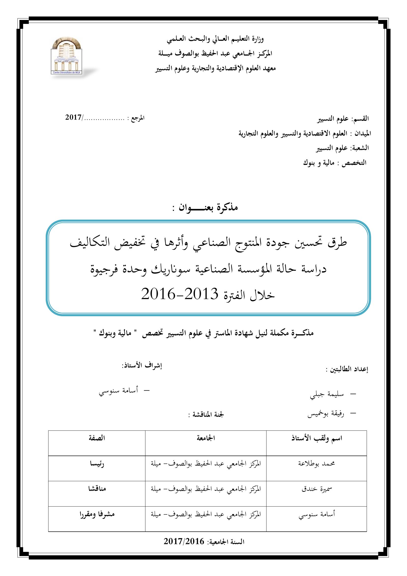 طرق تحسين المنتوج الصناعي وأثرها في تخفيض التكاليف : دراسة حالة المؤسسة الصناعية سوناريك وحدة فرجيوة خلال الفترة 2013-2016