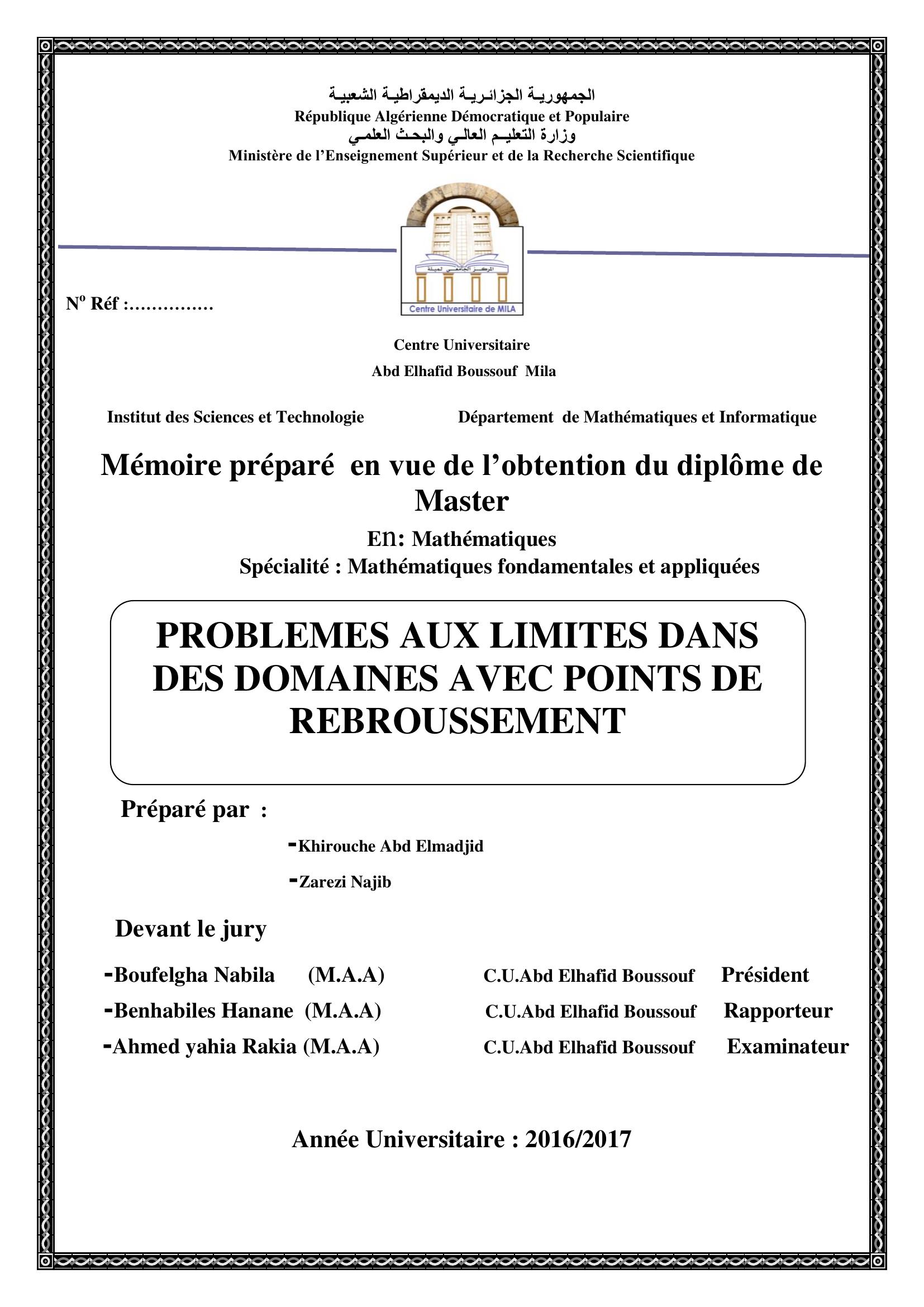 Zarezi najib & Boufelgha Nabila Président, B. (2017). Problemes aux limites dans des domaines avec points de rebroussement.