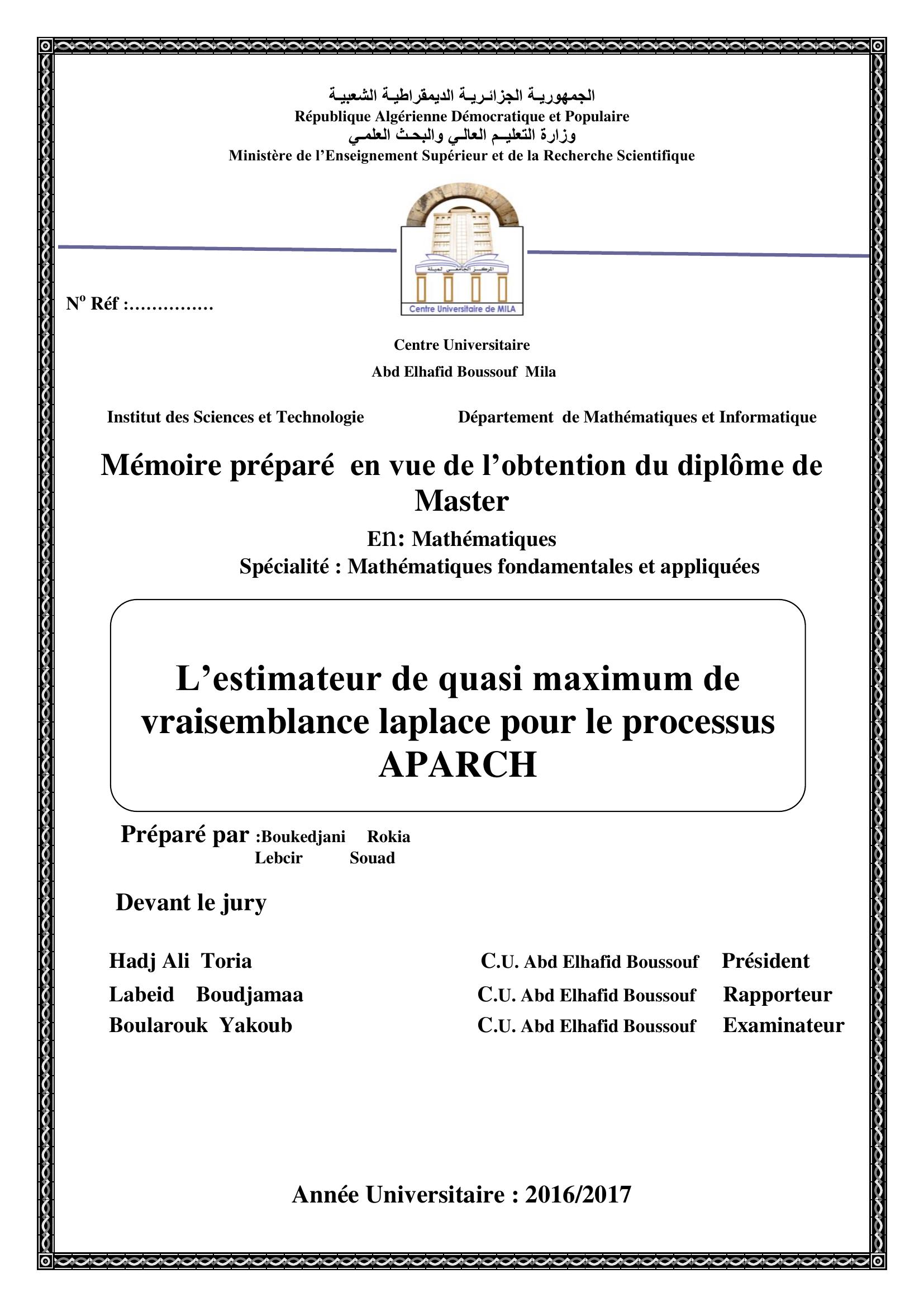 Boukedjani Roqiya & Hadj Ali Toria Président, L. (2017). l'estimateur de quasi maximmum de vraisenblance laplace pour le processus aparch.