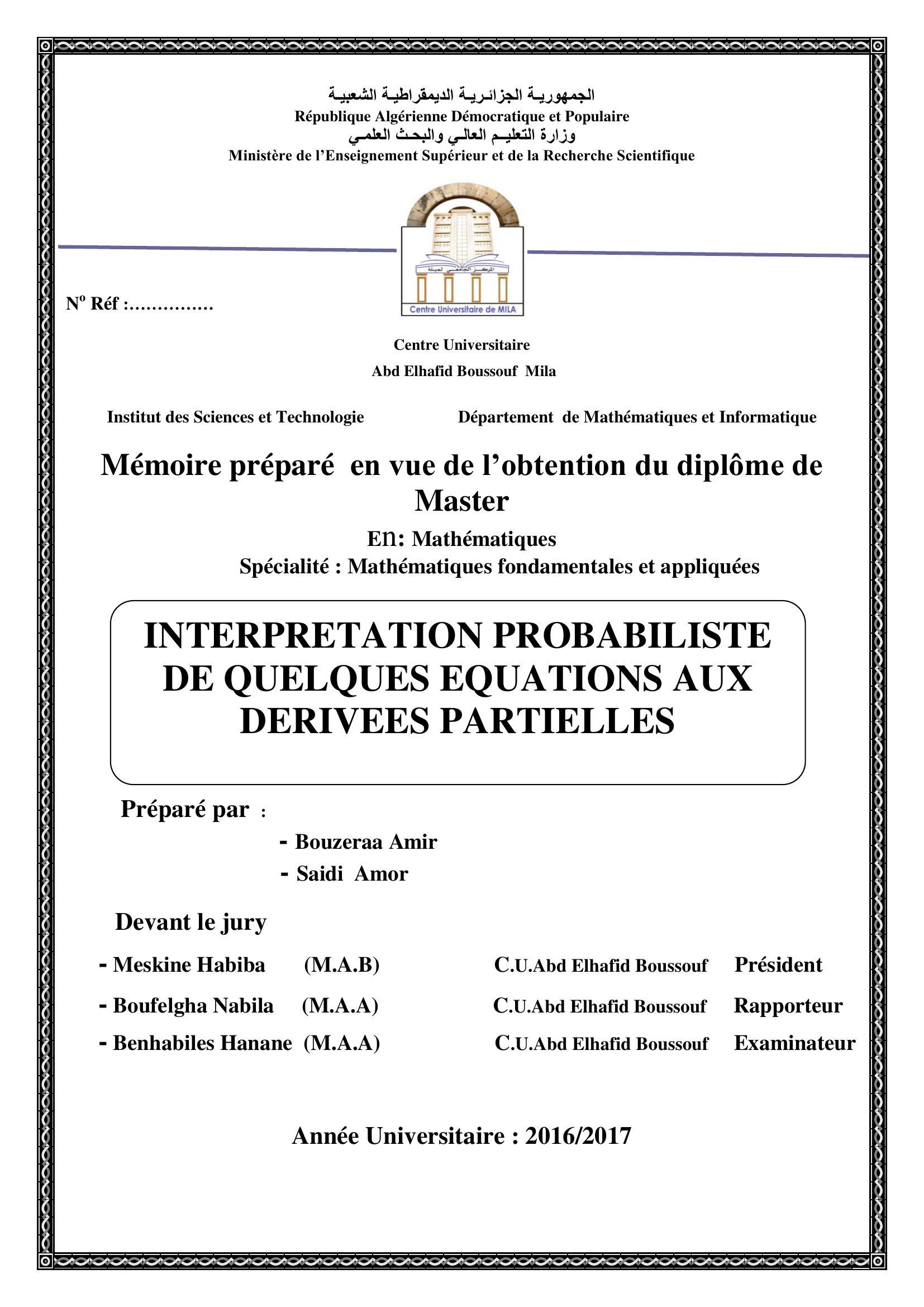 Bouzaraa Amir & Meskine Habiba Président, B. (2017). Interpretation probililiste de quelques equations aux deivees partielles.