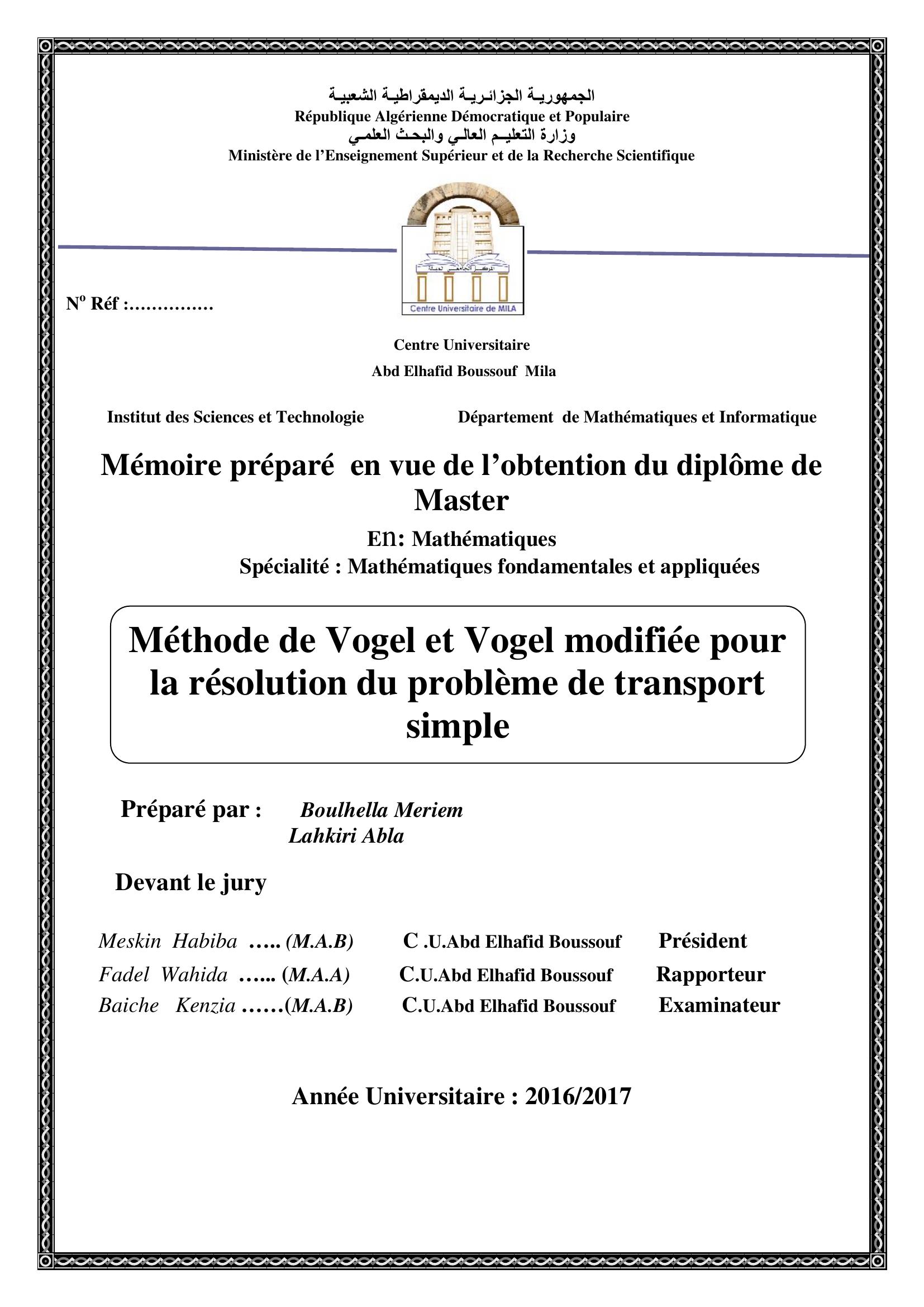 Boulhalla merieme & Meskin Habiba Président, F. (2017). Méthode de vogel et modifiée pour la résolution du problème de transport simple.