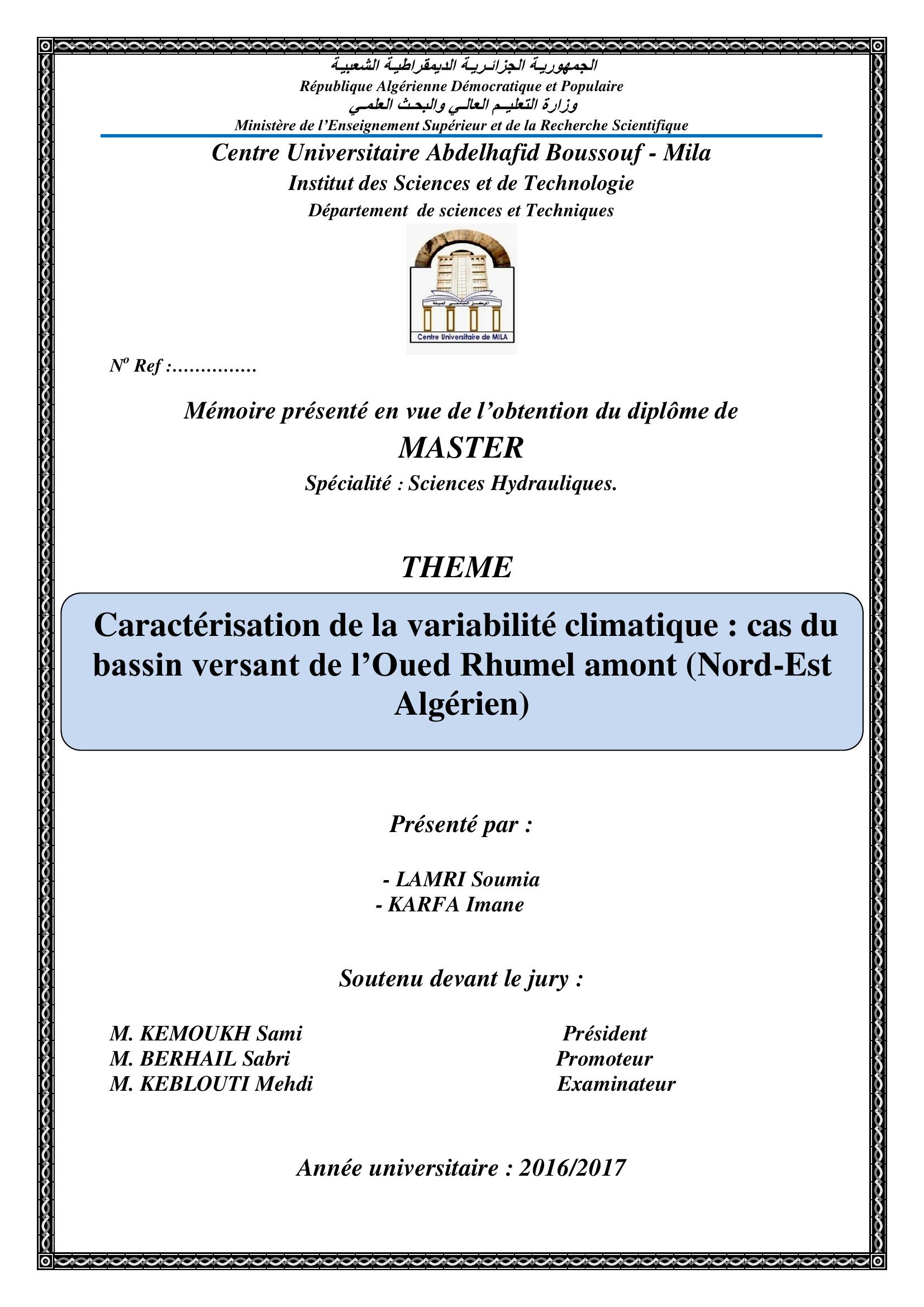 lamri soumia & KEMOUKH Sami Président, B. (2017). Caractérisation de la variabilité climatique: cas du bassin versant de l'oued rhumel amont (Nord-Est).