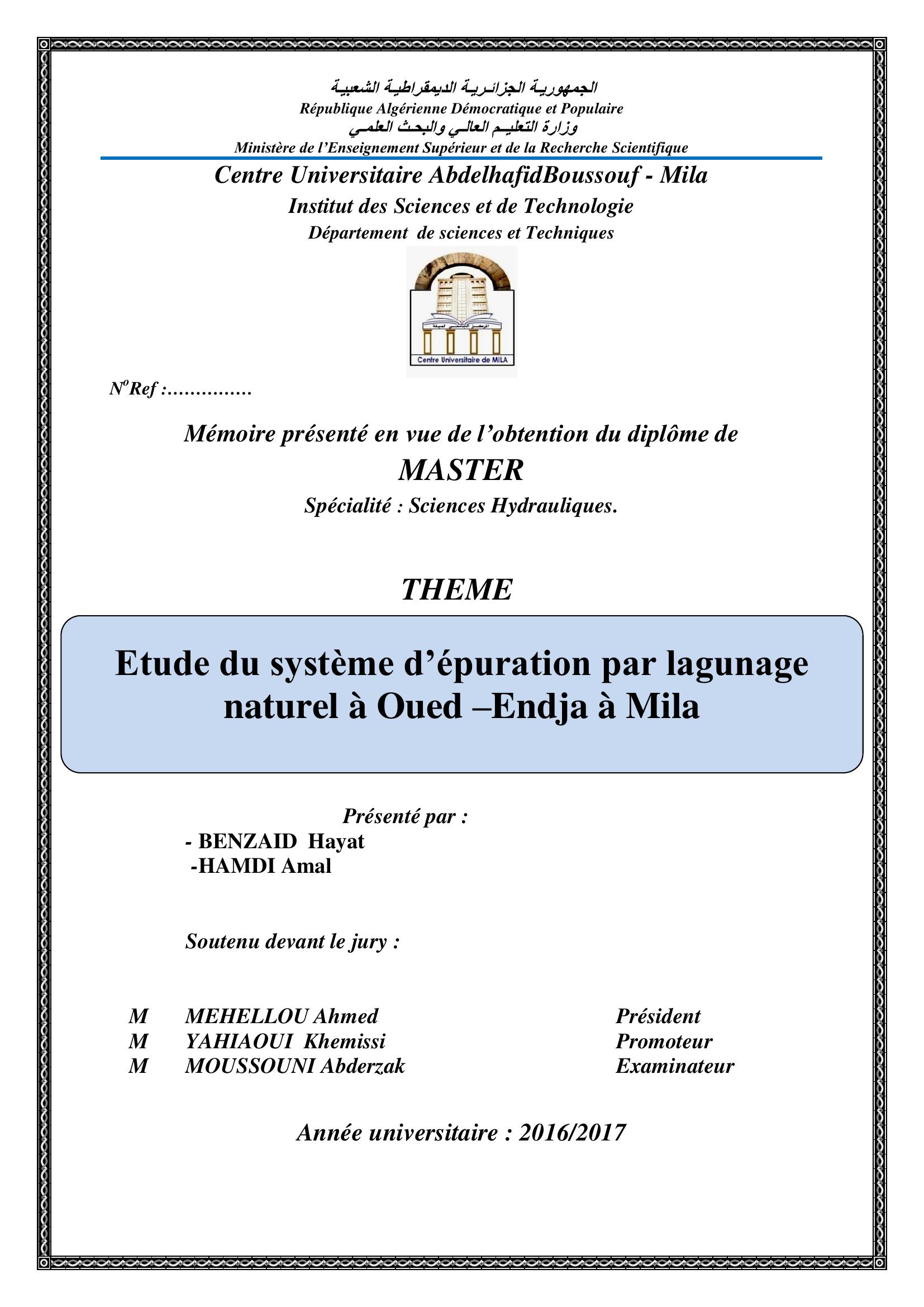 Benzaid hayat & MEHELLOU Ahmed Président, Y. (2017). Etude du systéme d'épuration par lagunage naturel à oued -endja à mila.