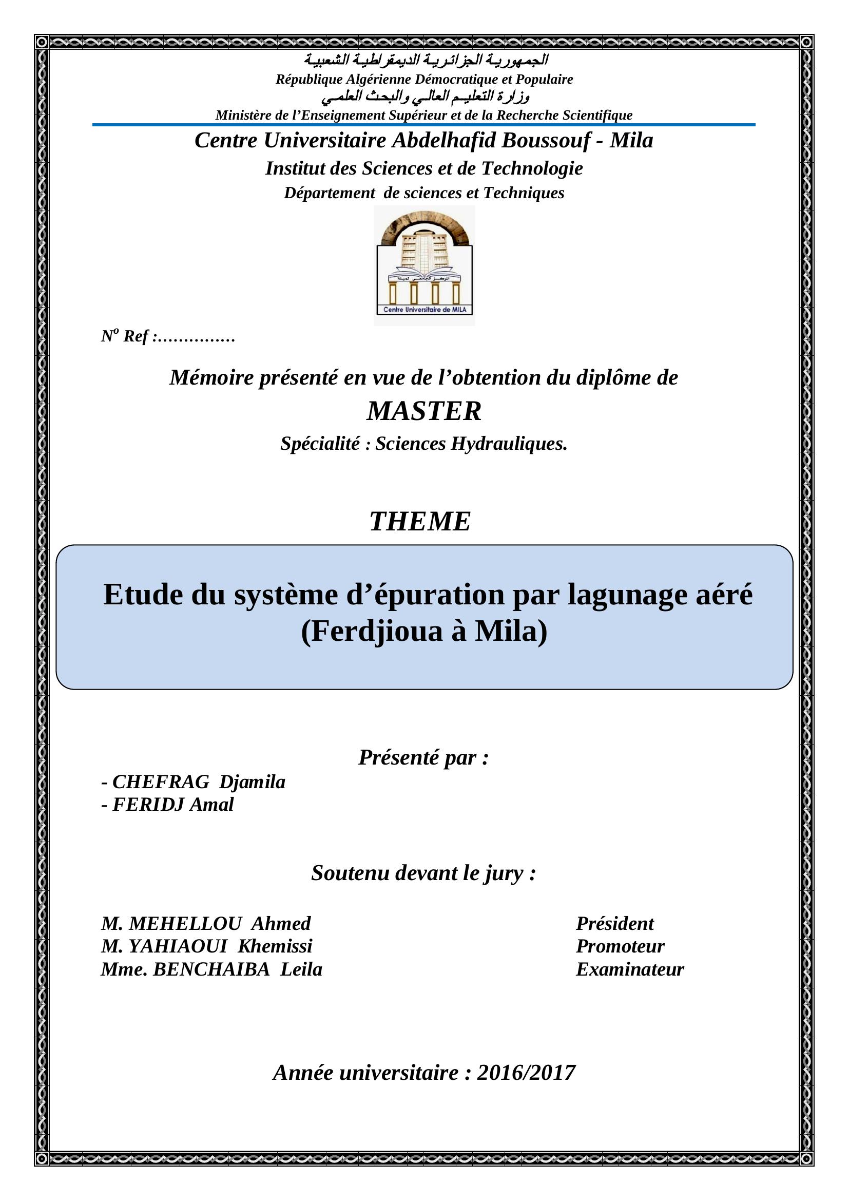 Chefrag djamila & MEHELLOU Ahmed Président, Y. (2017). Etude du systéme d'épuration par lagnageaéré ( ferdjioua à mila).