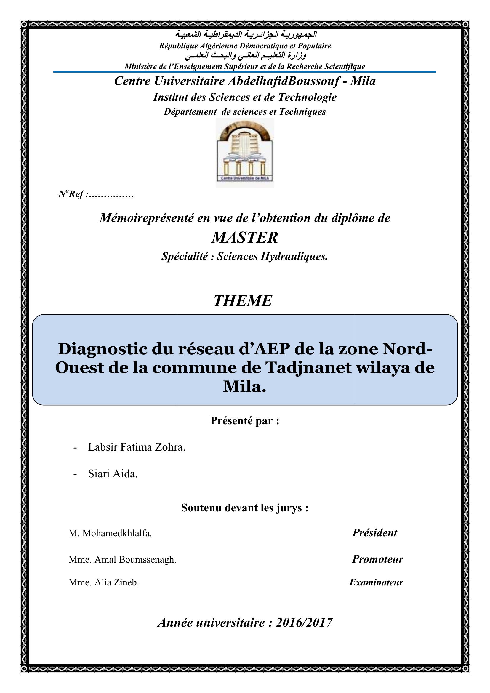 Siari aida & M. Mohamedkhlalfa Président, A. (2017). Diagnostic du réseau d'AEP de la zone nord-ouest de la communede tadjinanet wilaya mila.